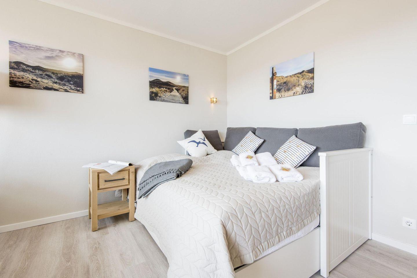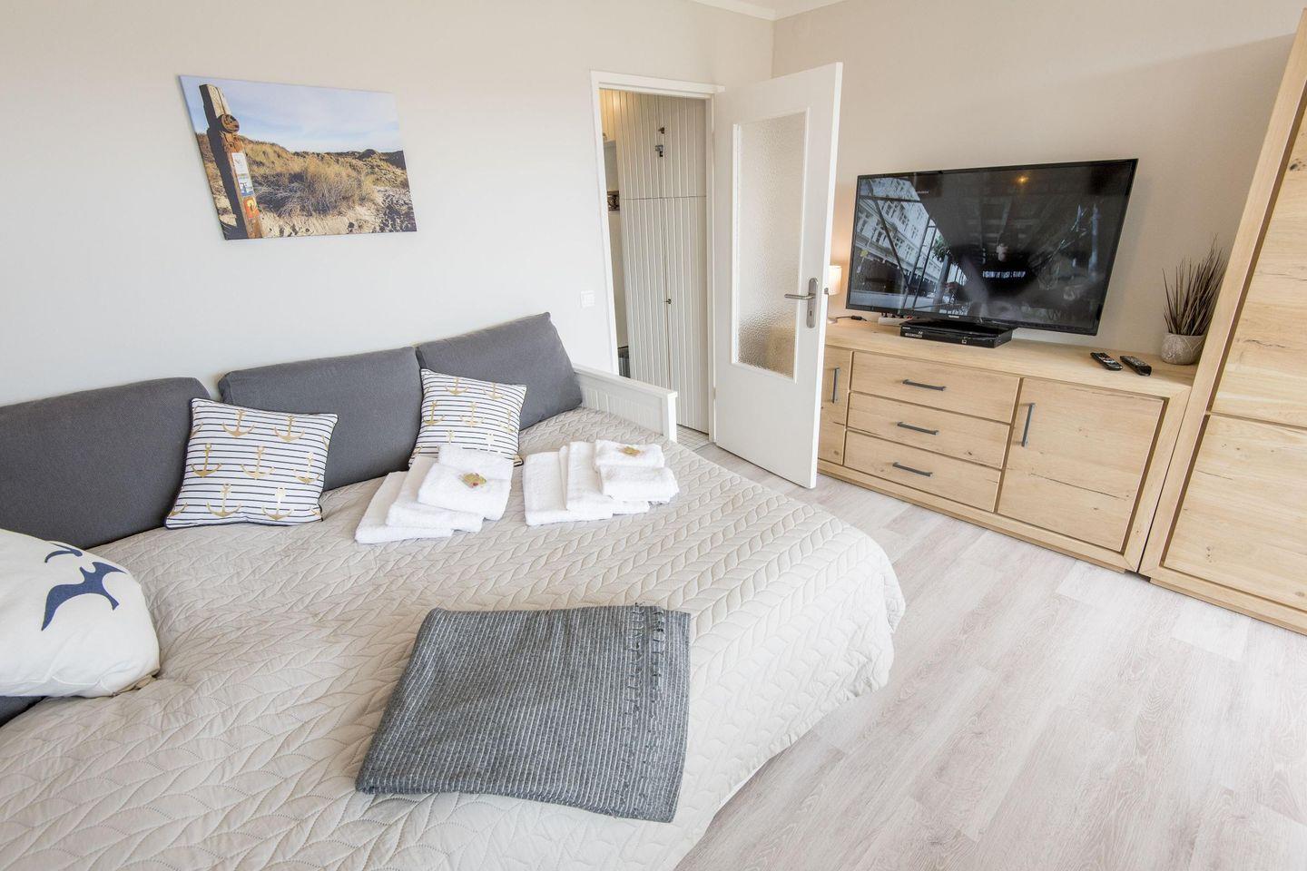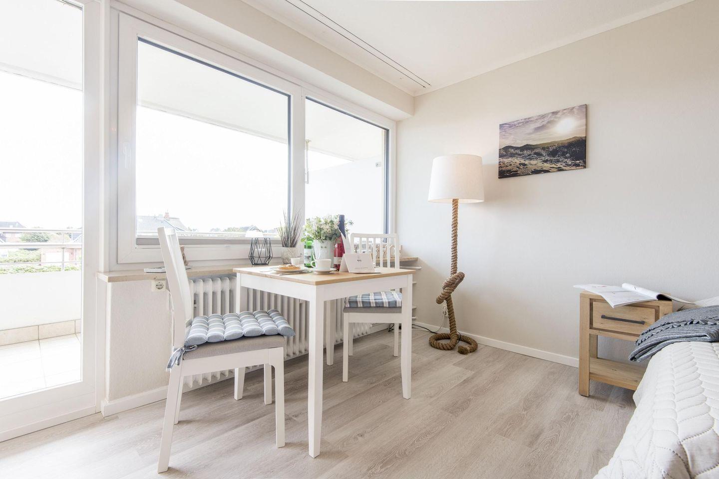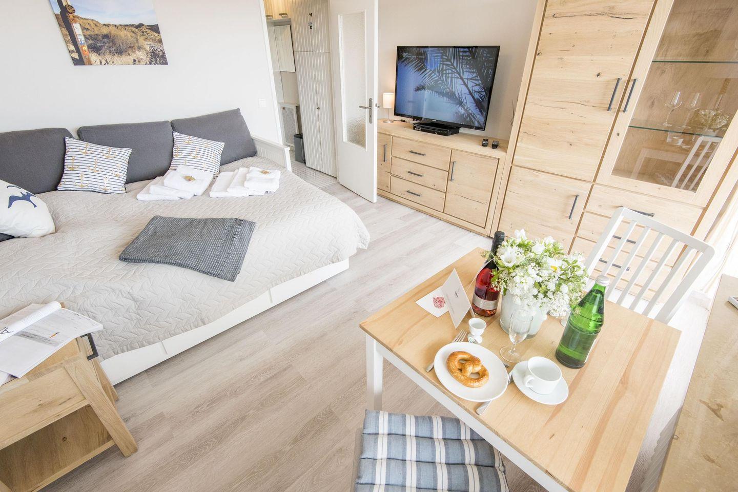 Der Wohn-/Schlafbereich ist mit einem komfortablen Doppelbett (160x200 cm) und einem TV ausgestattet, sodass Sie sich nach einem erlebnisreichen Tag entspannen können. Die gemütliche Essecke bietet Platz für zwei Personen, um gemeinsam zu speisen oder einen Kaffee zu genießen. Vom Wohnbereich aus haben Sie direkten Zugang zum Ostbalkon, auf dem Sie den Sonnenaufgang und die frische Nordseeluft genießen können.
