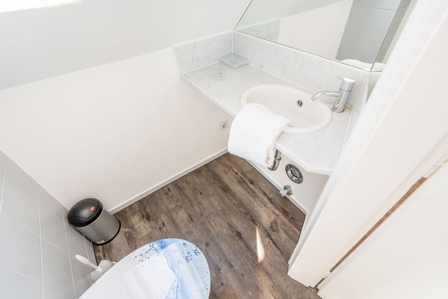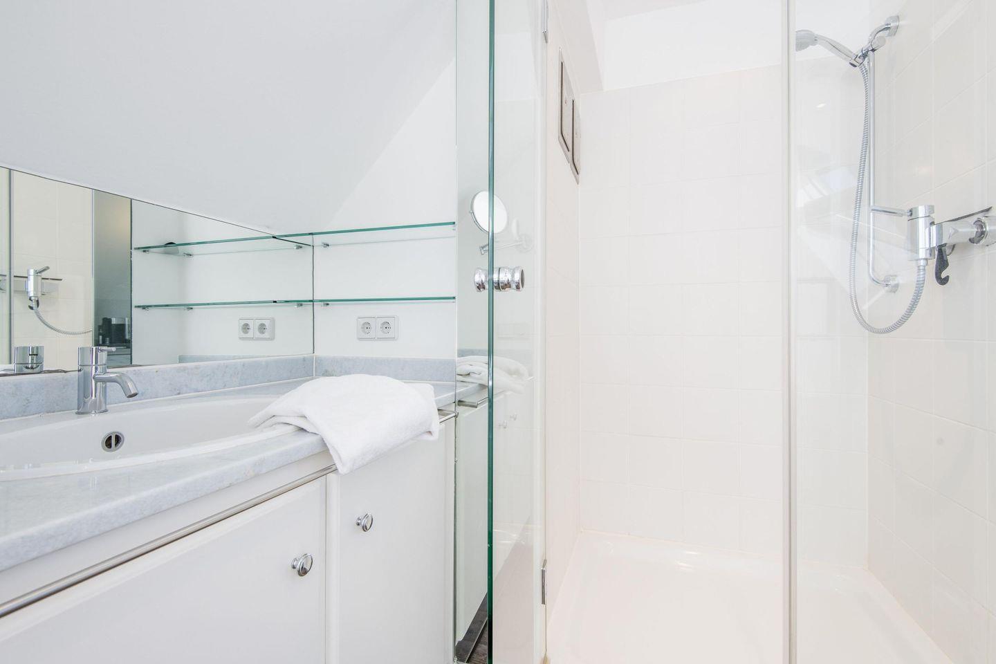 Das Schlafzimmer ist mit einem komfortablen Doppelbett (2x 90x200 cm) und einem geräumigen Einbauschrank ausgestattet, der viel Platz für Ihre Garderobe bietet. Ein zusätzlicher TV im Schlafzimmer sorgt für entspannte Abende im Bett. Direkt an das Schlafzimmer angeschlossen befindet sich das En-Suite-Badezimmer mit Dusche, Tageslicht und Föhn – hier können Sie den Tag erfrischt beginnen.