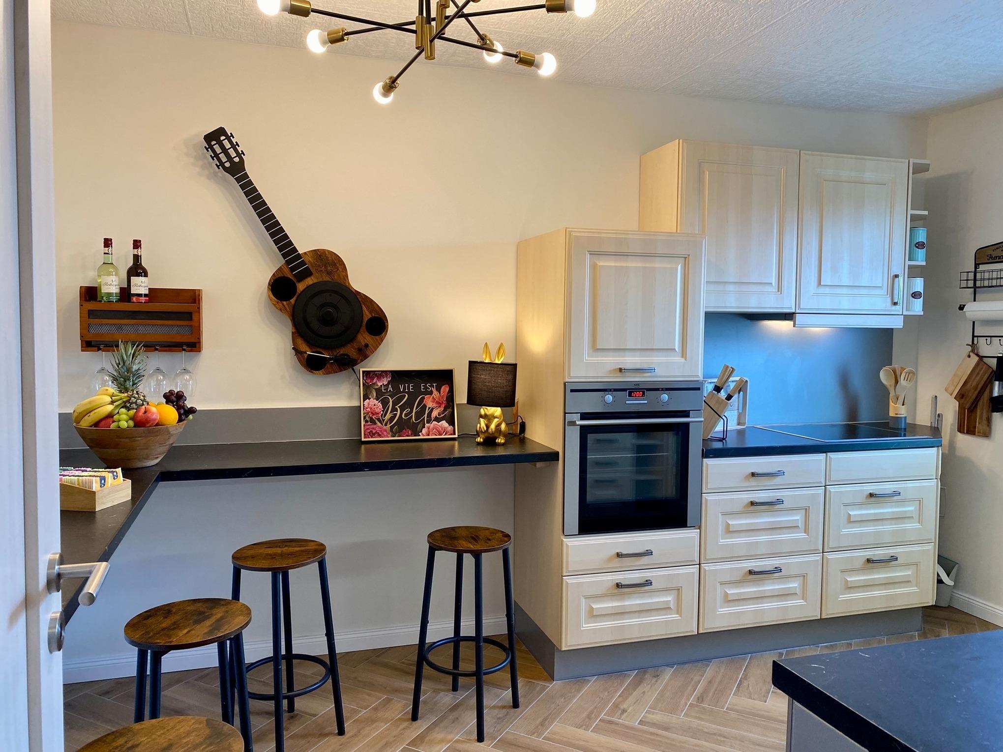 Die hochwertig ausgestattete Küche mit Backofen, Cerankochfeld, Spülmaschine, Kühlschrank, Kaffeemaschine, Toaster und vielem mehr lädt zum gemeinsamen Kochen ein. Im angrenzenden Esszimmer finden an einem großen Tisch bis zu 6 Personen Platz – ideal für gesellige Runden.