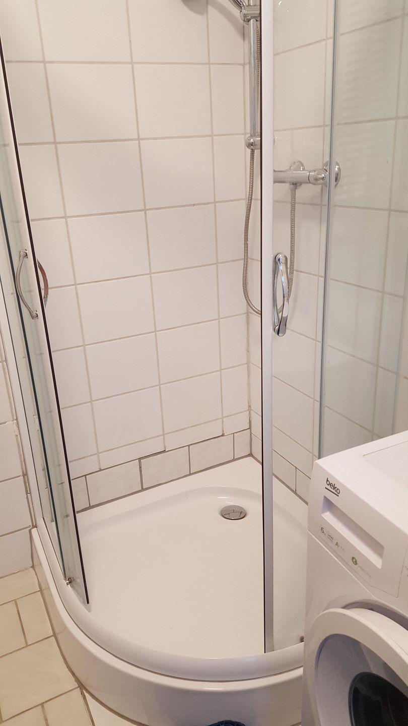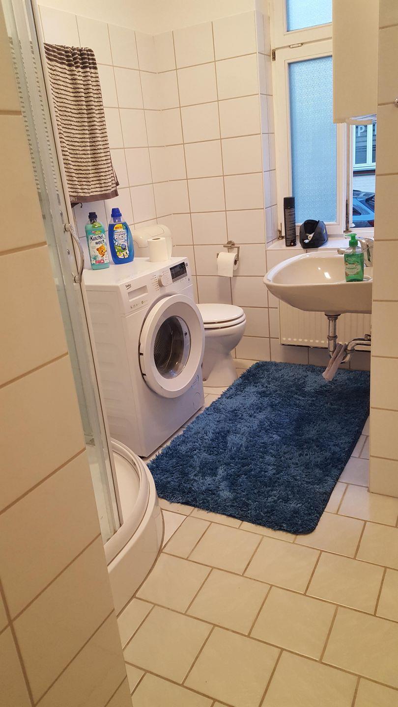 Im Tageslichtbad befindet sich neben der großzügigen Dusche, Waschbecken und WC eine Waschmaschine zur Alleinnutzung. Das Bad verfügt zusätzlich über ein Fenster. Im Flur der Unterkunft gibt es eine Garderobe, an der Jacken und Mäntel aufgehängt werden können.