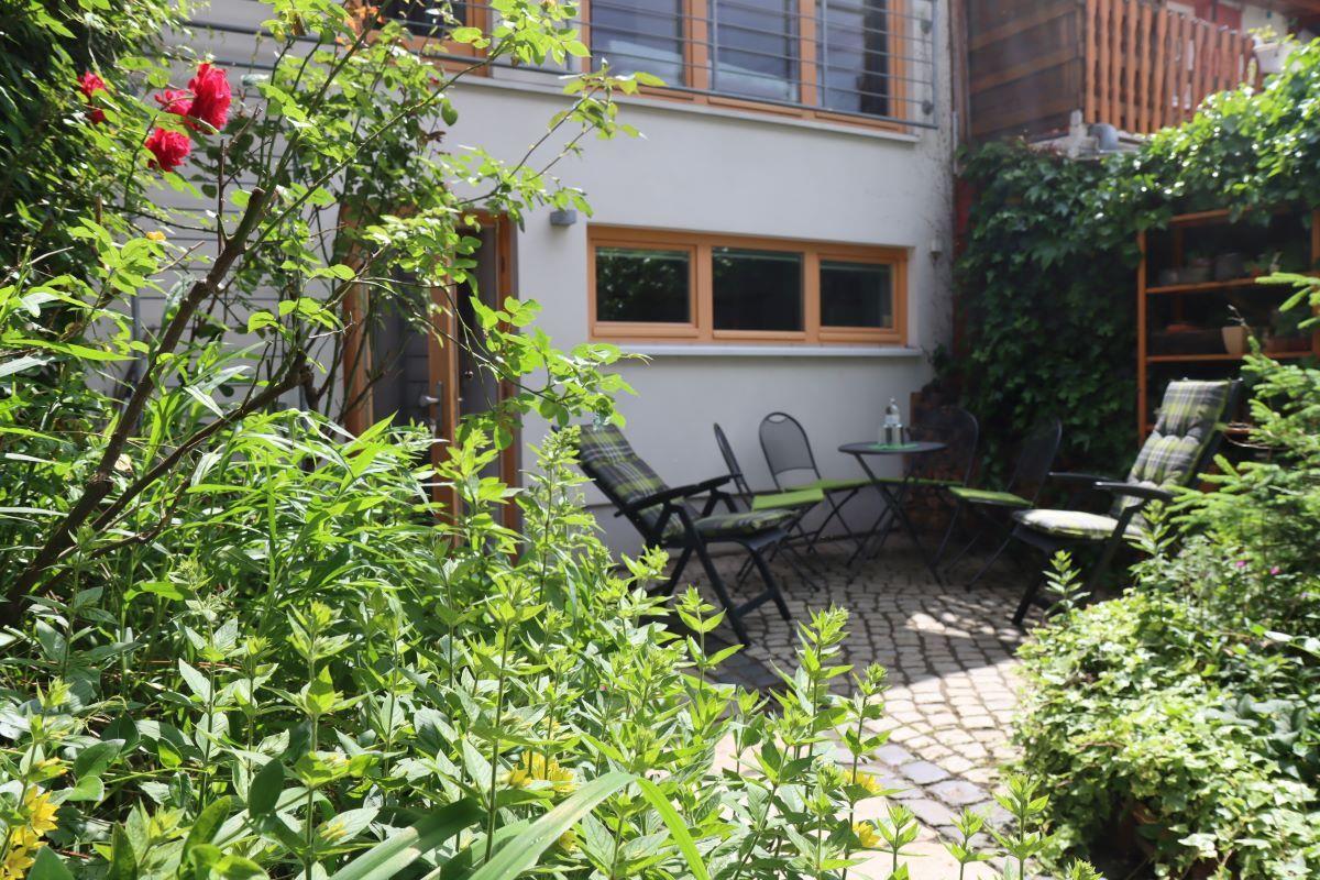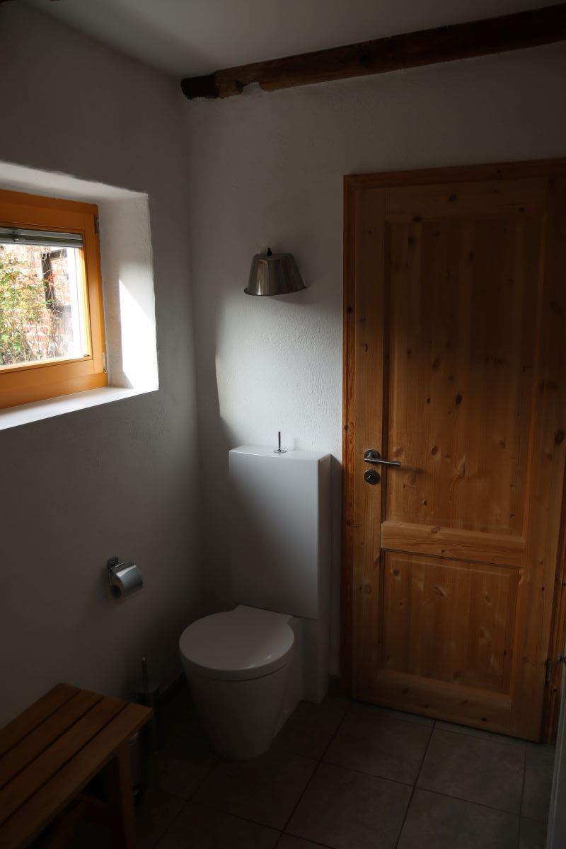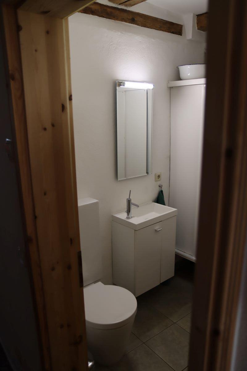 Im Erdgeschoss befindet sich eine Wohnküche mit Bank und Stühlen. Die Küche ist ausgestattet mit Herd, Backofen, Kühlschrank, Mikrowelle und Geschirrspüler. Ferner finden Sie im Erdgeschoss ein Badezimmer mit Badewanne/Dusche, WC, Waschbecken und Fußbodenheizung. Nebenan befindet sich ein weiterer Raum mit WC und Waschbecken. Vom Flur geht es direkt in den Innenhof, wo Sie Gartenmöbel zum Verweilen und Entspannen finden.