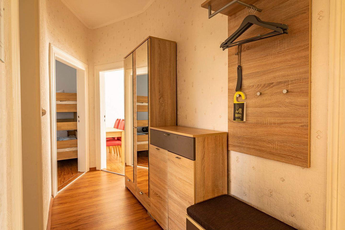 Die Ferienwohnung befindet sich im 1.OG, ist für 6 Personen ausgestattet und verfügt über ein großes Wohn- und Esszimmer. Die Küche ist ausgestattet mit Herd, Backofen, Kühlschrank mit Tiefkühlfach, Kaffeemaschine sowie einem Toaster, Wasserkocher, ausreichend Geschirr, Gläser und Besteck.
