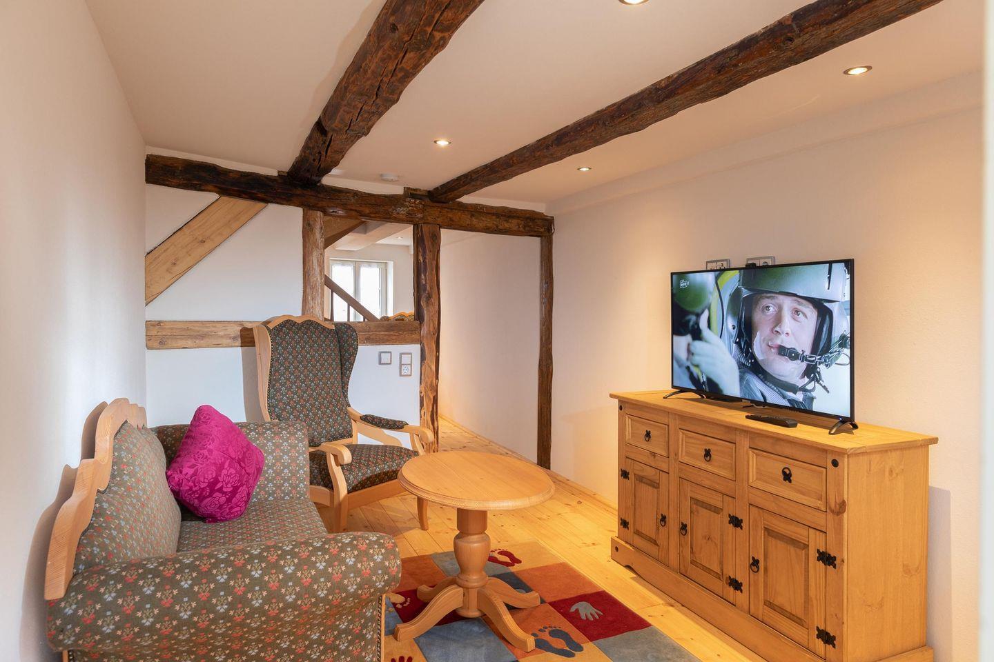 Über eine massive Echtholztreppe geht es in die obere Etage zu der gemütlichen Leseecke mit einer großen Bücherauswahl. Dort befindet sich auch das Wohnzimmer mit Sessel und Couch und großem Flachbild-TV. Von hier gelangen Sie auf die Terrasse hinter dem Haus mit Sitzmöglichkeiten. Der Außenbereich kann auch von den Gästen nebenan genutzt werden und ist durch einen Sichtschutz teilbar.