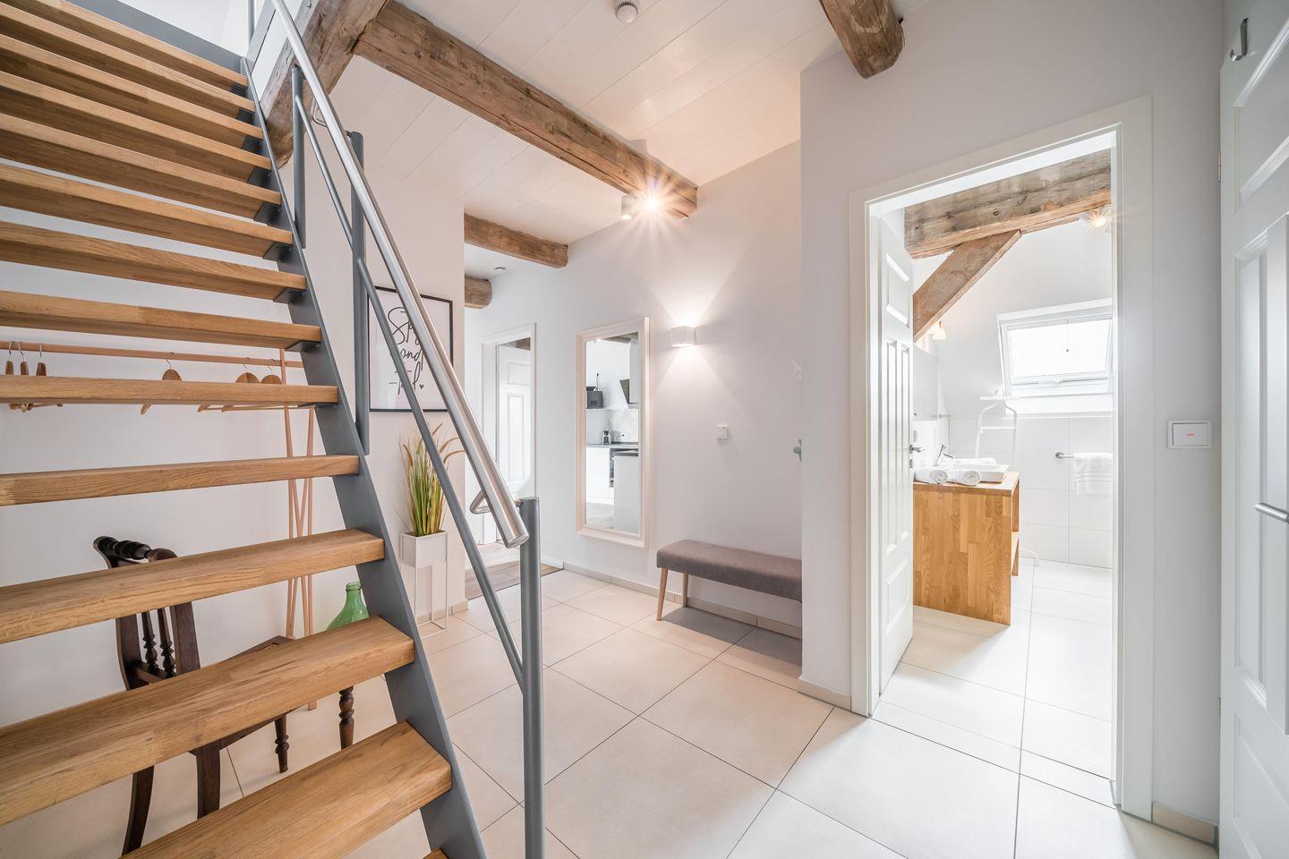 Die Wohnung verteilt sich über zwei Etagen und besteht aus zwei gemütlichen Schlafzimmern, einem einladenden Wohnzimmer, einer offenen, voll ausgestatteten Küche und einem modernen Badezimmer. Die hellen Räume sind stilvoll möbliert und versprühen eine gemütliche Atmosphäre, die zum Wohlfühlen einlädt. Die Fußbodenheizung sorgt in der kalten Jahreszeit für angenehme Wärme und Gemütlichkeit.