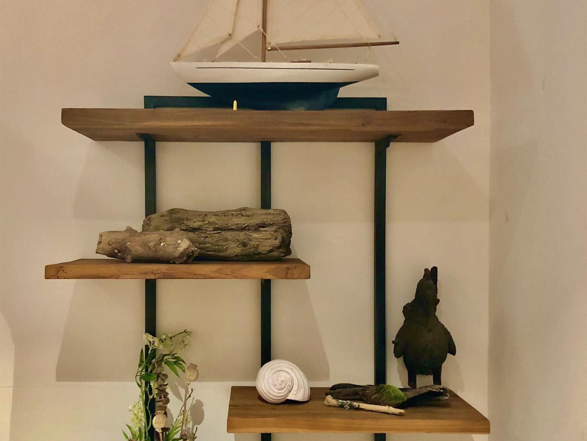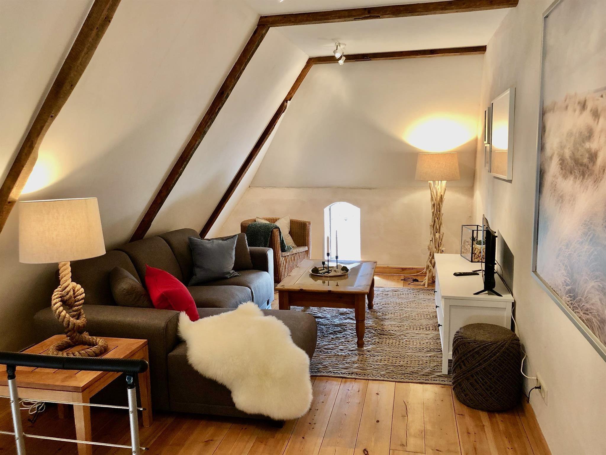 Im Obergeschoss stehen Ihnen neben einem separaten, stilvollen Wohnzimmer mit TV und XXL-Sofa mit der Bibliothek ein weiterer Rückzugsort zur Verfügung. Dieser ist über eine Galerie sehr hell und offen gestaltet, verbreitet mit Bildern & Einrichtung sehr viel Nordsee-Flair und bietet durch eine tolle Dachgabue einen Blick Richtung Leuchtterm. Die Ausstattung haben wir auch hier bspw. mit einer bequemen Recamiere modern-maritim gehalten.