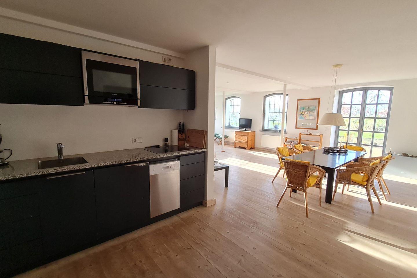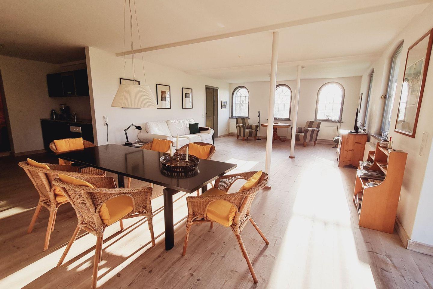 Insgesamt stehen vier Wohnungen zur Verfügung. Eine davon ist als großzügiger Seminar- und Atelierraum eingerichtet. Das lichtdurchflutete Atelier bietet viel Platz für Workshops, Yoga, Coaching, kreative Prozesse oder Gruppenarbeiten und lässt sich flexibel an unterschiedliche Formate anpassen. Für Präsentationen stehen Ihnen Beamer, Leinwand, Whiteboard und Flipchart zur Verfügung. Genießen Sie die Ruhe des