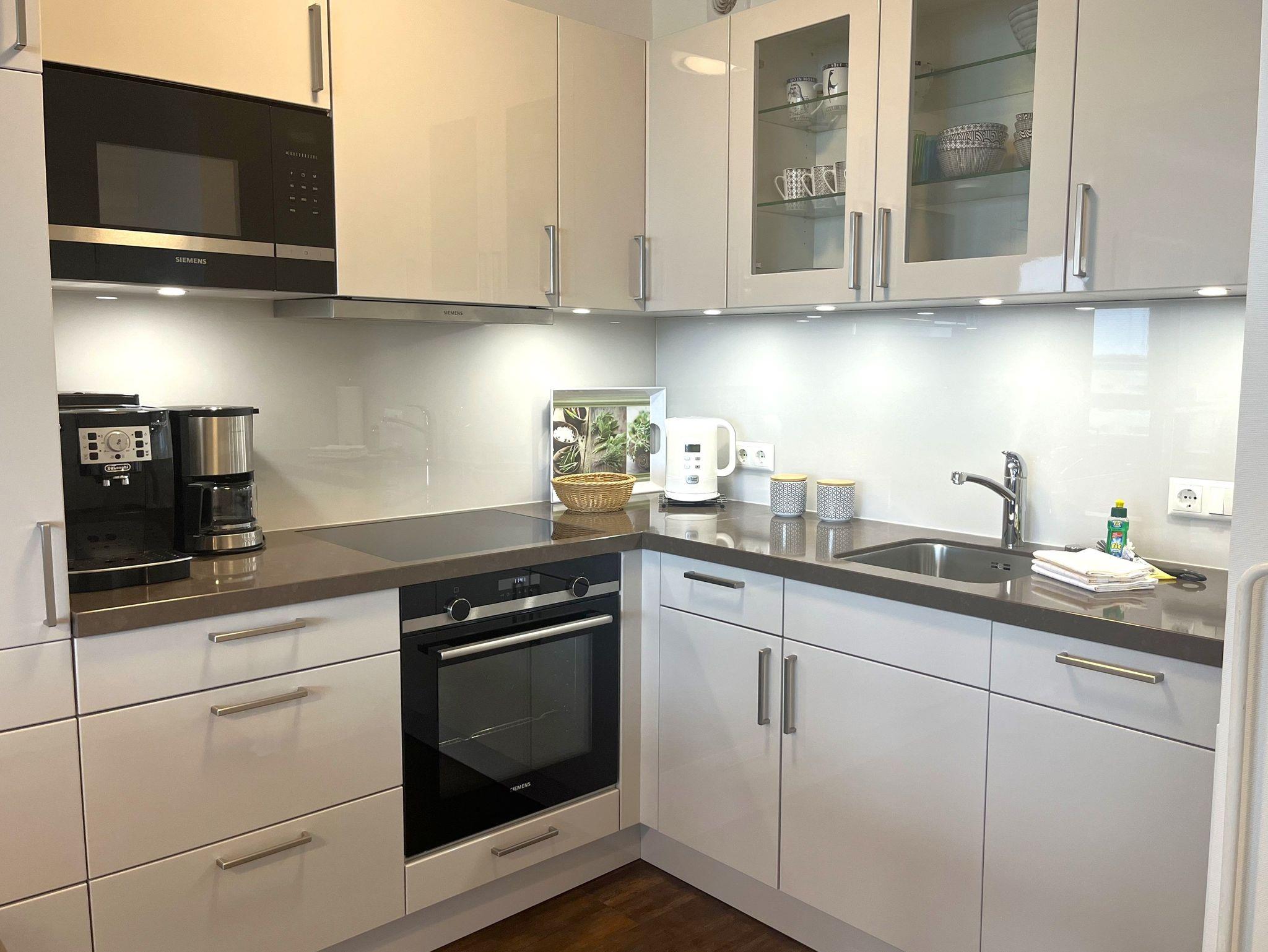 Sie erreichen die Wohnung, die sich im Sparkassengebäude befindet, barrierefrei über den Fahrstuhl, machen die Tür auf und erleben sofort eine freundliche Wohlfühlatmosphäre. Der Urlaub kann beginnen! Die Wohnung ist kpl. renoviert. Sie wohnen in einem Wohnzimmer mit offener Küche. Das Wohnzimmer hat eine gemütliche Ledercouch. Zum bequemen fernsehen gibt es einen 55? Monitor mit einem gemütlichen Stressless-Fernsehsessel. Sie schlafen in einem bequemen Boxspringbett. Die Wohnung ist mit warmen, pflegeleichten Vinyl-Designboden ausgestattet; das Bad ist gefliest. Die Küche ist kpl. ausgestattet, hat ein Induktionskochfeld, Backofen, Mikrowelle und alles, was man braucht, wenn man sich auch mal selbst verpflegen möchte. Dafür stehen auch die üblichen Dinge wie z. B. Filter-Kaffeemaschine sowie Kaffeevollautomat, Toaster, Wasserkocher und Geschirr bereit. Das freundlich hell geflieste Bad hat eine Dusche mit tiefem Einstieg, ein WC sowie einen komfortablen Waschtisch. Ein Fön ist vorhanden. Auch für Ihre Wäsche brauchen Sie nicht in den Keller. Diese können Sie in der Wohnung waschen, in der sich auch der Trockner befindet. Die Wohnung hat einen Balkone, der aus dem Wohnzimmer erreichbar ist, mit Ausrichtung Ost/Süd-Ost. Der Haupteingang ist über die Paulstraße zu erreichen und befindet sich rückseitig zur Maybachstraße. In der Wohnung befindet sich praktischerweise viel Stauraum für Ihr Gepäck. Somit können Sie für jedes Wetter etwas einpacken und so lange bleiben, wie Sie wollen. Sie können alles gut verstauen und werden trotzdem viel Wohlfühlplatz haben. Im Außenbereich ist ein Müll-Sammelraum zu finden (mit Müllschlucker aus jeder Etage). Auch für unsere kleinen Gäste ist gesorgt. Es stehen auf Wunsch und Vorbestellung ein Kleinkinderset (bis 3 Jahre), bestehend aus einem Hochstuhl und einem Reisekinderbett (ohne Bettwäsche) kostenlos zur Verfügung.