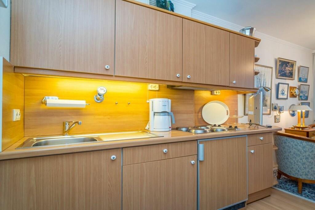 Very well-maintained 1-room apartment, approximately 23m², on the 3rd floor. West-facing, no balcony, overlooking Friedrichstraße. Living room/bedroom with laminate flooring, Double Murphy bed (1.60m x 2m), Seating/dining area with 3 armchairs and a round glass table, TV, radio, Kitchenette with - 4-burner stove, - Kettle, - Toaster - Egg cooker - Coffee machine Shower room with towel dryer and toilet. Parking space on the parking deck (no allocation). Locked bicycle storage room. Please note: There are steps in the entrance area, followed by the elevator. Non-smoking apartment. Pets are not permitted. Bed linens and towels can be booked for a fee.