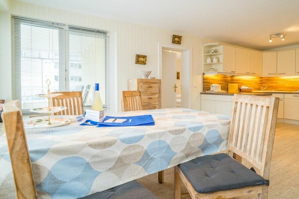 Apartment 1, Haus Sola Bona, for max. 4 people This 2-room apartment, with an open-plan kitchen, is located on the 1st floor and has an east-facing balcony. 2 additional bunk beds are available in the hallway. A surcharge of EURO10 per person per day applies for the third person or more. Living room Living/dining room, cable TV Stereo/CD player Balcony Telephone Wi-Fi included (no guarantee) Kitchen Fitted kitchen Dishwasher 4-burner ceramic hob Oven Bedroom with double beds 2 bunk beds in the hallway Shower room General information One small dog is permitted. Parking space no. 1 is located behind the house. Note: For shorter booking periods, please check the availability calendar for follow-up bookings.