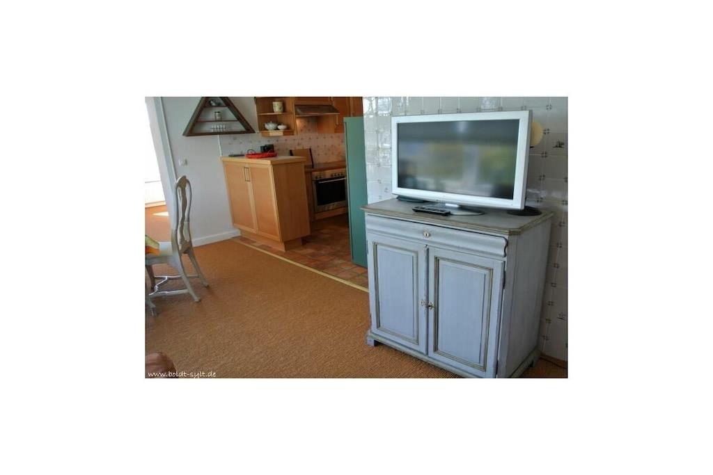 This two-room apartment with an open-plan kitchen is located on the third floor and features an east-facing balcony. There are also two additional bunk beds in the hallway. The living/dining room has cable TV, a stereo/CD player, and a balcony. Wi-Fi is included (no guarantee). The apartment also has a fully equipped kitchen with a dishwasher. The bedroom has a double bed, and there are two bunk beds in the hallway. A shower room with a mirror is provided. Parking space no. 28 is located behind the building, to the right of the garages.
