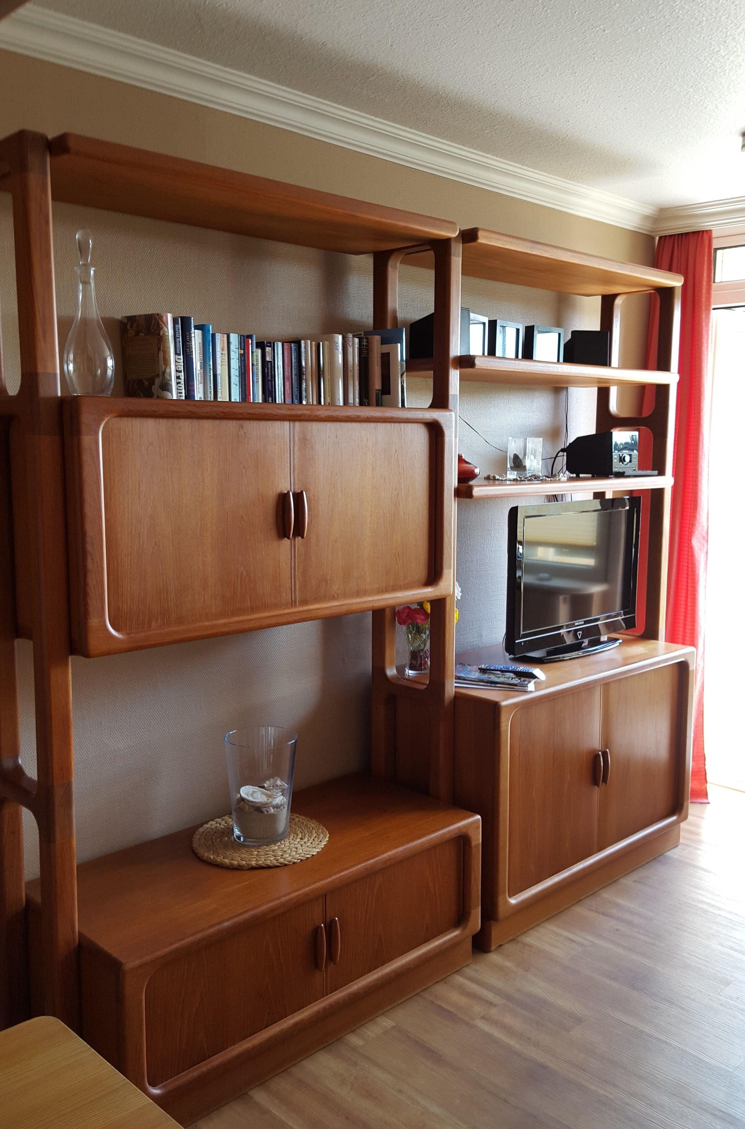In der Schrankwand im Wohnzimmer befindet sich der Fernseher und die Stereoanlage.