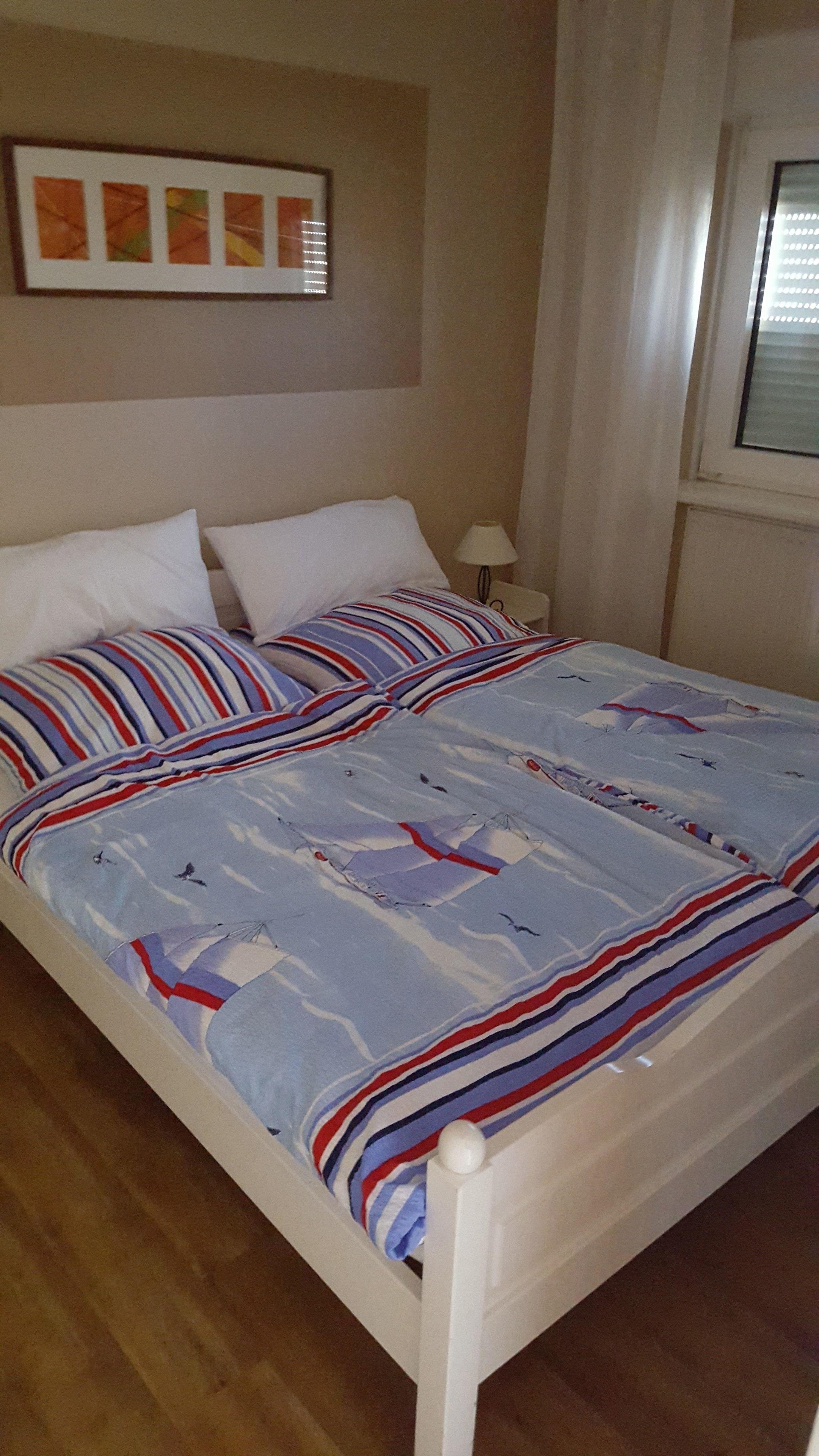 Im Schlafzimmer finden Sie ein (1,6*1,90 m Matratze, Neu Dez.2021) Doppelbett. Der Schlafraum hat Außenrolladen zum Verdunkeln. Im Wohnzimmer befindet sich eine 1,60 m x 2,00 m ( Querschläfer)) breite Ausziehcouch..