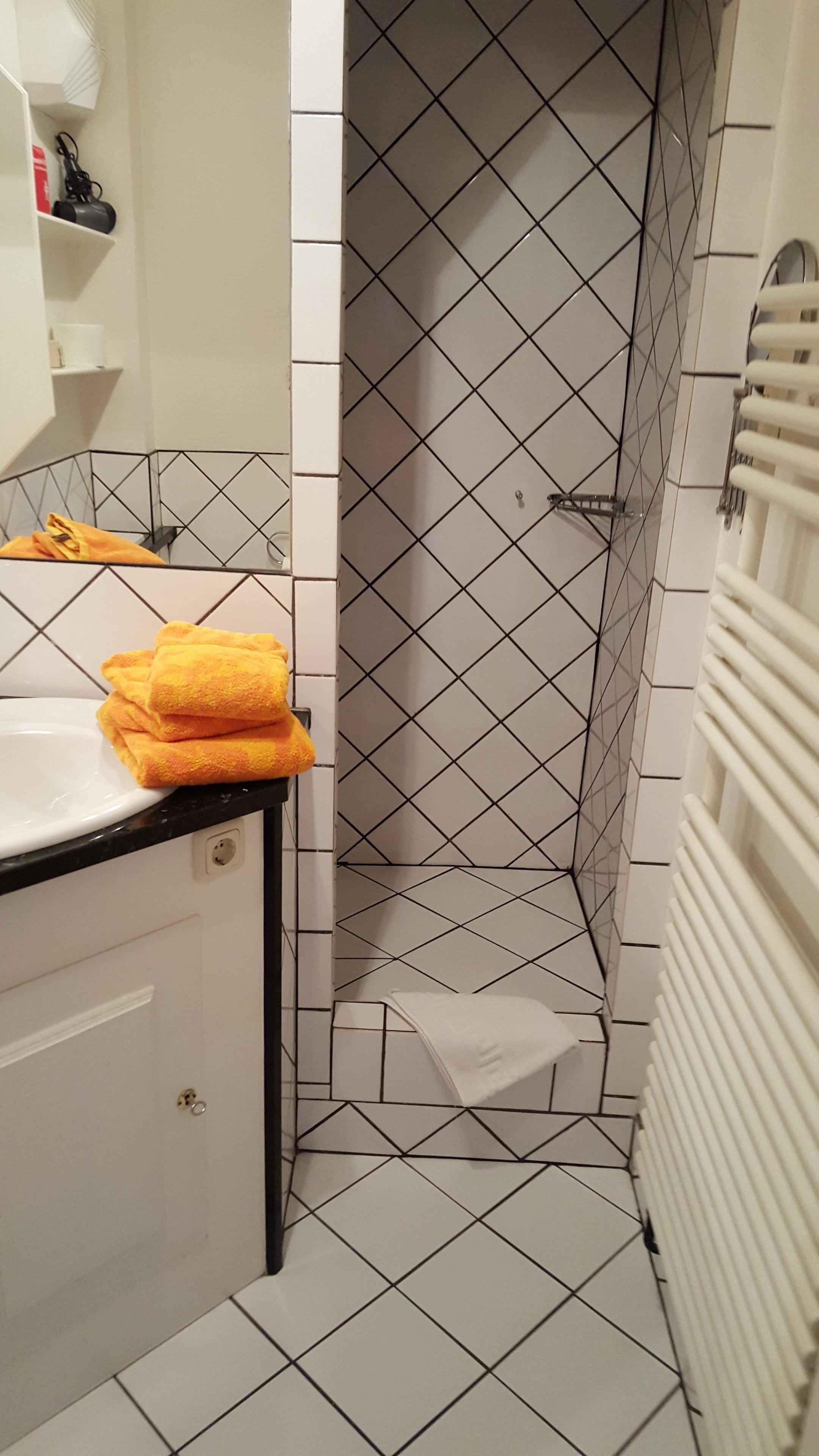 Das Badezimmer(Dusche) hat einen Fliesenfußboden.