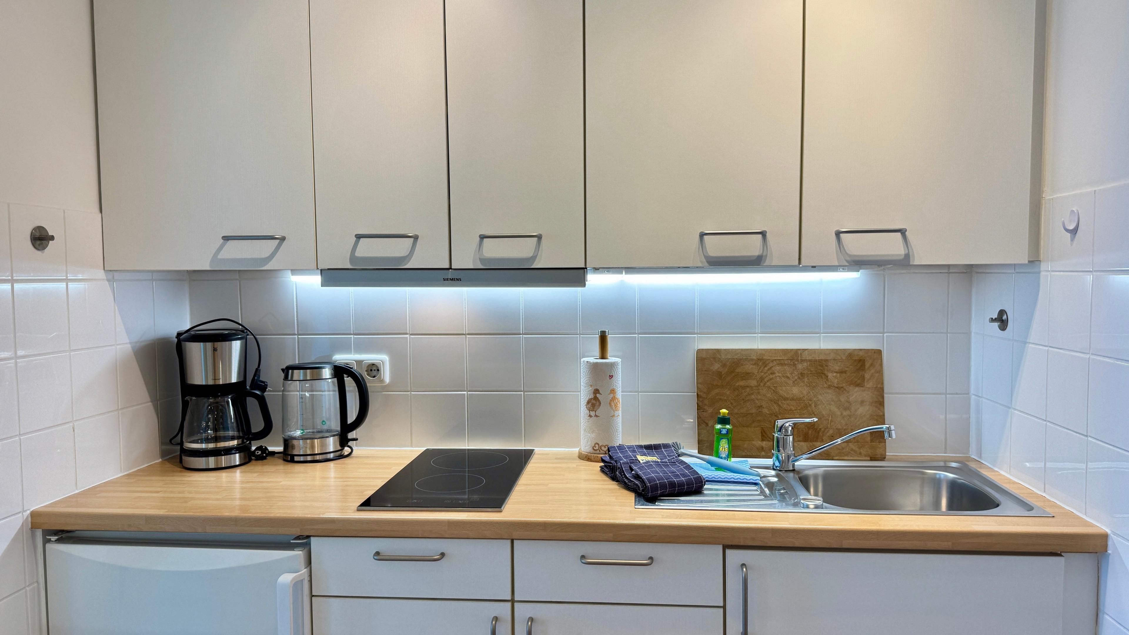 Im Flur befindet sich eine gut ausgestattete Einbauküche mit Cerankochfeld (2 Platten) und Kühlschrank mit Gefrierfach.