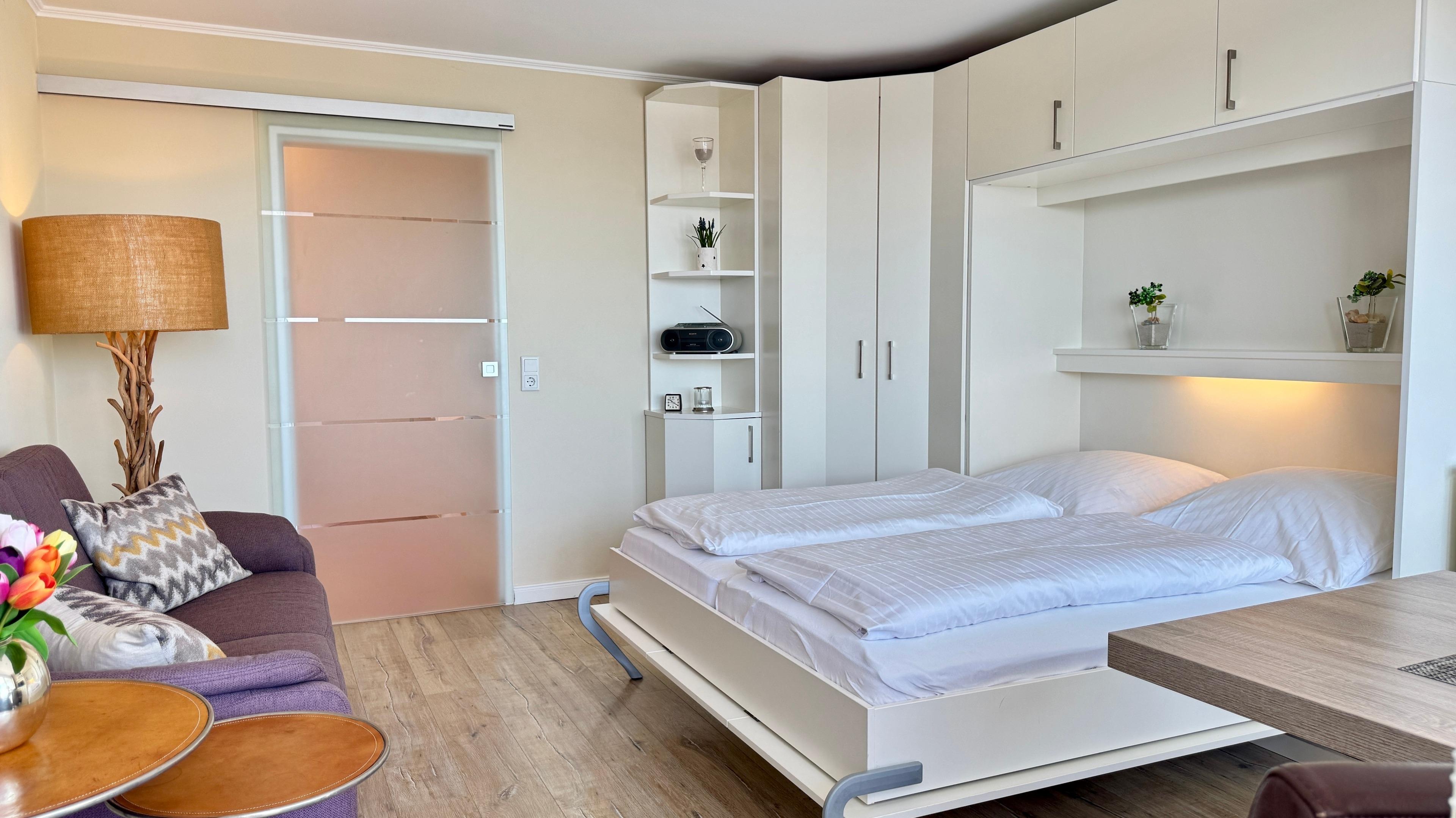 Diese gemütliche Wohnung punktet durch ihre einmalige Lage und den herrlichen Ausblick. Der lichtdurchflutete Wohn-/Schlafraum ist mit einem modernen Vinyl-Fußboden ausgestattet. Eine komfortable Couch mit zwei Beistelltischen, ein Essplatz mit zwei bequemen Ledersesseln direkt am Fenster sowie eine praktische Schrankwand mit Kleiderschrank und einem Doppelschrankbett (je 80x200 cm) schaffen ein wohnliches Ambiente. Bodentiefe Fenster sorgen für ein helles Raumgefühl und führen hinaus auf den Ostbalkon, von dem Sie den Sonnenaufgang und die Weite der Insel genießen können.