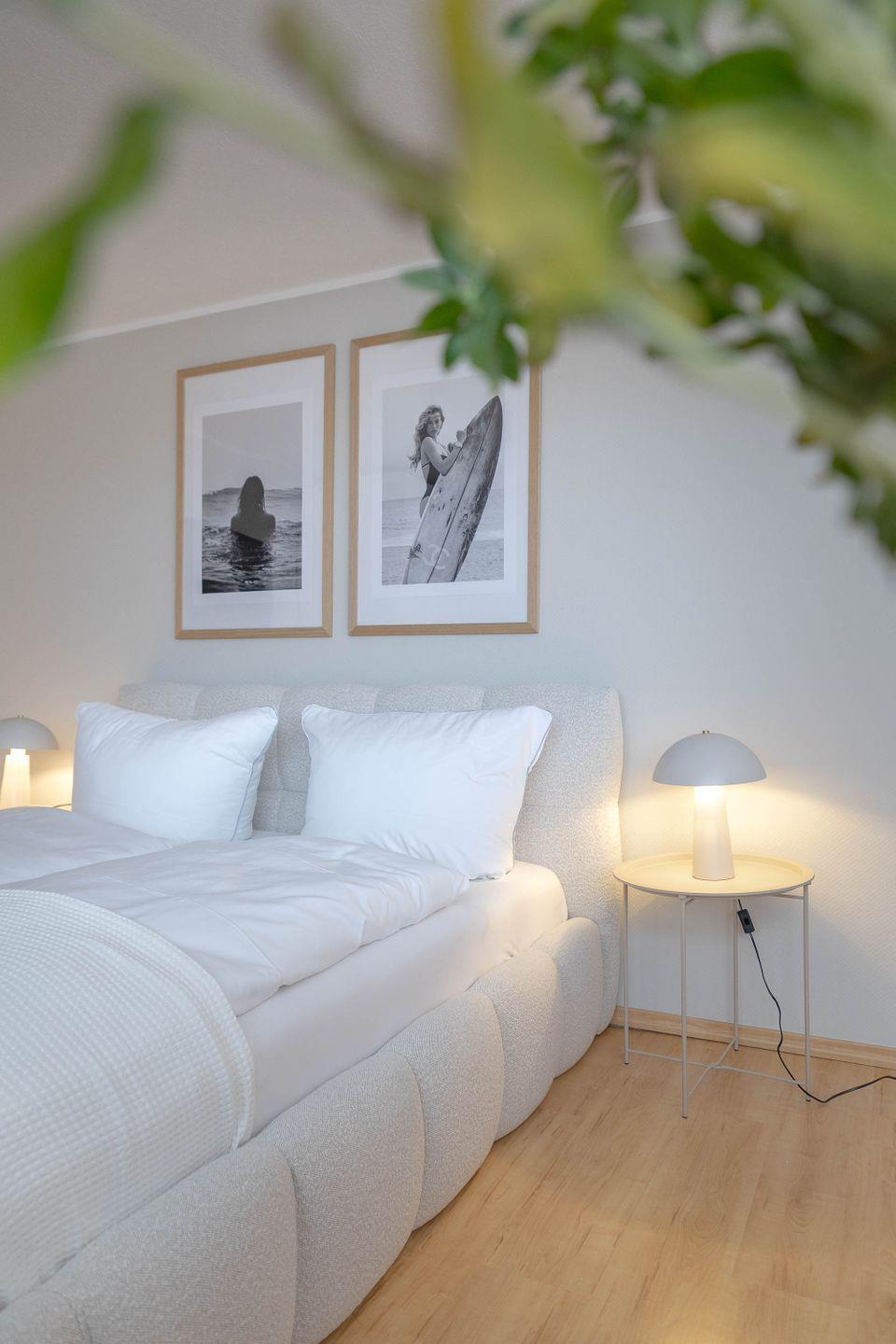 Das komfortable Bett ist mit einem hochwertigen Bouclé-Stoff bezogen und bietet mit 160 x 200 cm angenehmen Schlafkomfort. Zwei bequeme Modulsessel schaffen eine gemütliche Sitzgelegenheit – perfekt, um nach einem Strandspaziergang bei einem Buch oder einem Glas Wein zu entspannen.