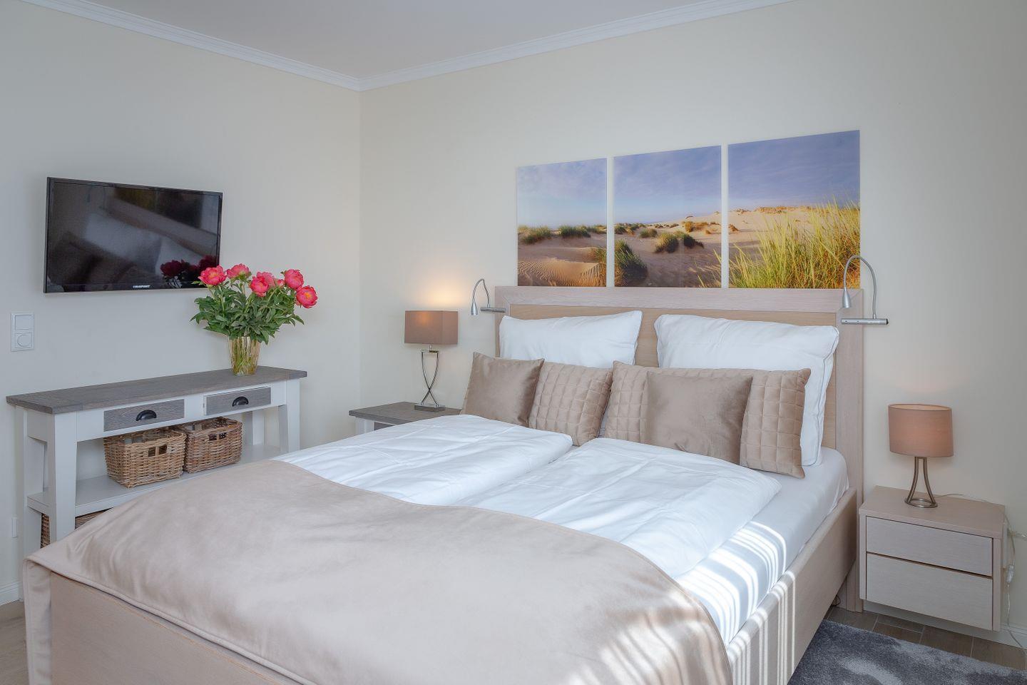 Westerland, das Luxuspaket, Wohnung SYLT ROYAL: Die großzügige, eben komplett sanierte 3 Zimmer Luxuswohnung befindet sich in der 3. Etage im Haus Windhuk in bester Strandlage gegenüber dem Strandübergang. Die Wohnung bietet mit 2 Schlafzimmern Platz für 4 Personen. Hier überzeugt nicht nur die Toplage, sondern auch die elegante Ausstattung. Sie werden empfangen von hellen großzügigen Räumen mit modernster Ausstattung: Wohnraum mit Westbalkon (Sonnenuntergang über den Dünen und kleiner Meerblick), Schlafzimmer mit Doppelbett (1,60 x 2,00 m) mit kleinem Südbalkon; das zweite Schlafzimmer mit Doppelbett (1,80 x 2,00 m) mit Flat TV. Modernes Duschbad, komplette separate Küche. Ein PKW Stellplatz rundet das Angebot ab. Im Haus: Fahrstuhl und Waschküche. Nichtraucher, keine Tiere. Der Preis bezieht sich auf 2 Pers. pro Nacht. Jede weitere Pers. zzgl. pro Nacht 10,00 €