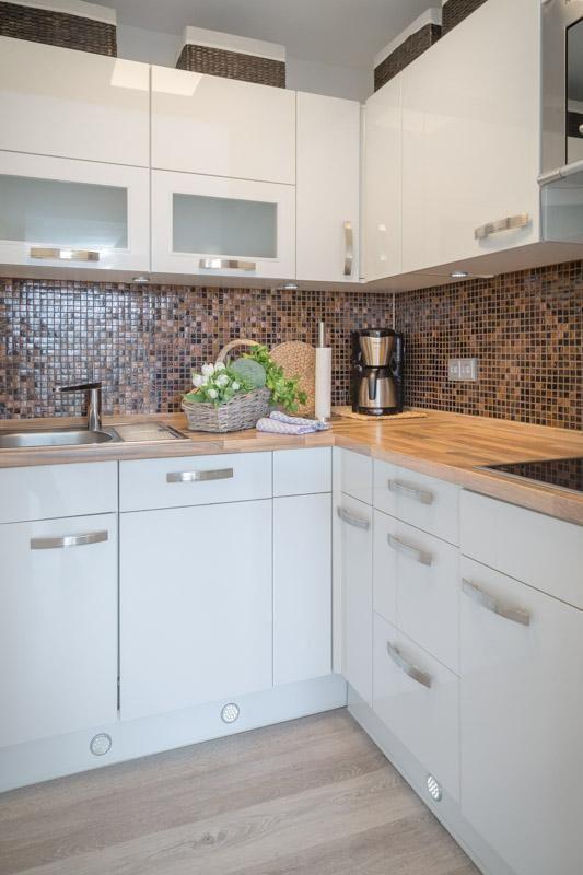 Großzügiger Wohnraum mit exklusivem Turm-Eichenfußboden, hochwertigen Nehl Wohnmöbeln inkl. 160 cm Schrankbett. Am Fenster lädt ein großer Echtholztisch zum Speisen ein. Dazu gib es Kabelfernsehen auf einem großen LCD TV (inkl. DVD Player), bzw. Musik aus der Stereoanlage. Moderne Lichttechnik setzt Akzente. Hochglanzküche mit Geschirrspüler, Grill / Mikrowelle, Cerankochfeld, Abzugshaube und Kühl/Gefrierschrank. Das sep. Schlafzimmer hat ein maßangefertigtes Echtholzdoppelbett mit 7-Zonen-Kaltschaummatratze, verstellbaren Lattenrost und Allergiebetten + LCD Flachbildschirm. Das Bad wurde mit hochwertigen Granitfliesen ausgestattet. Besondere Akzente durch braunes Glasmosaik. Fön und Radio im Bad vorhanden, auch eine Waschmaschine steht zur Verfügung. Der Westbalkon bietet tolle Nachmittagssonne und herrliche Sonnenuntergänge.