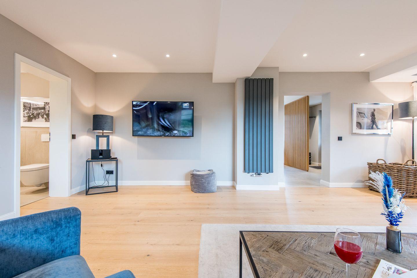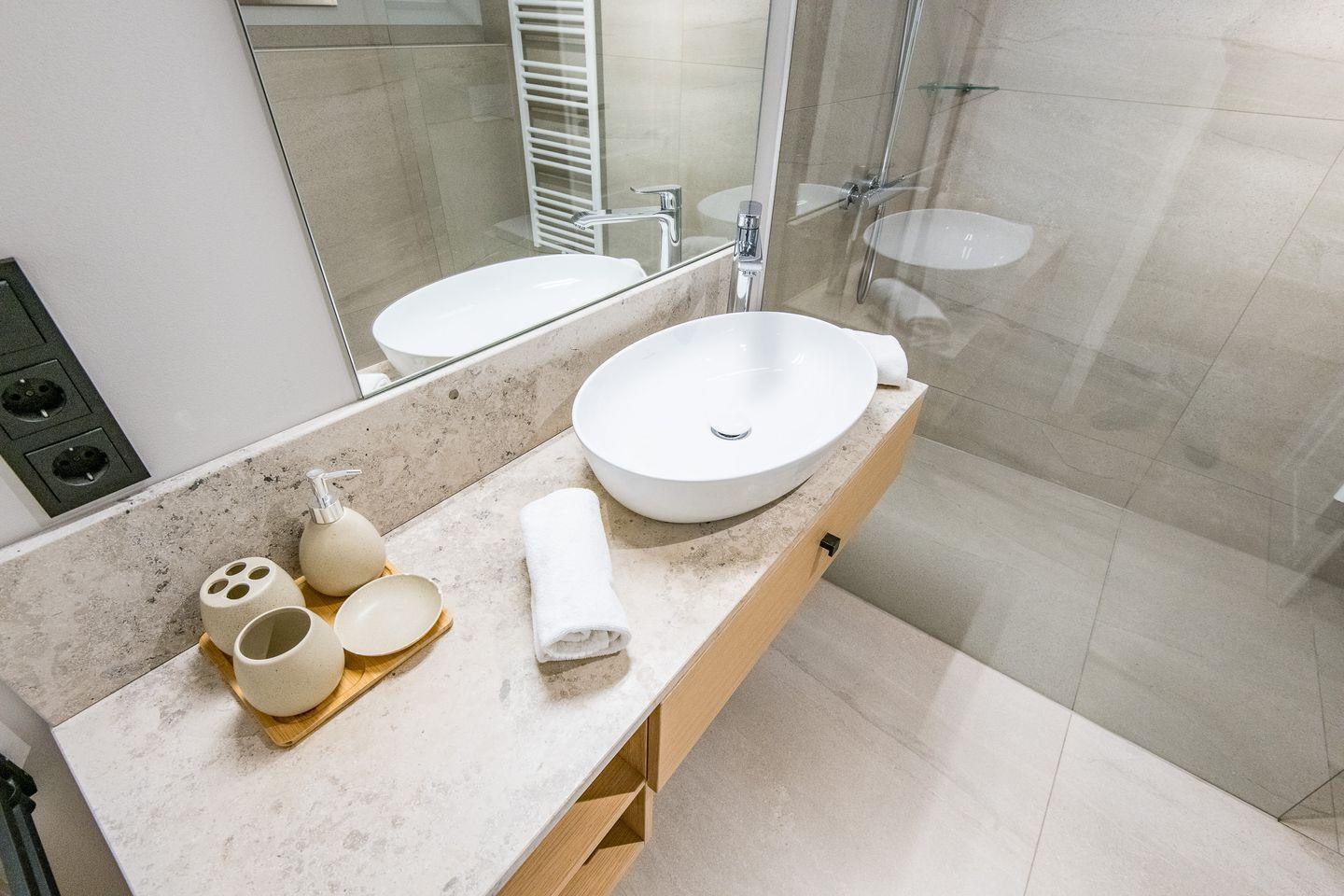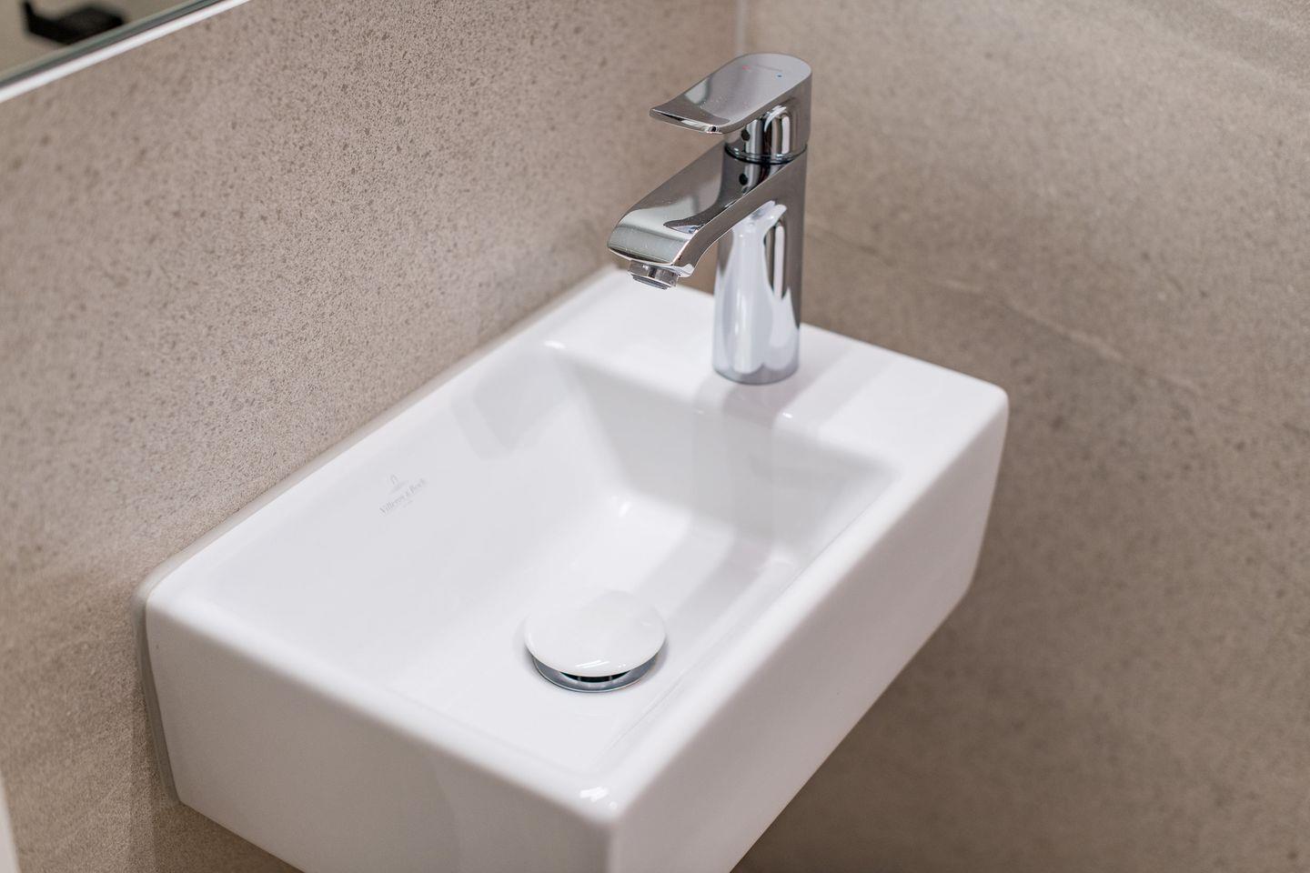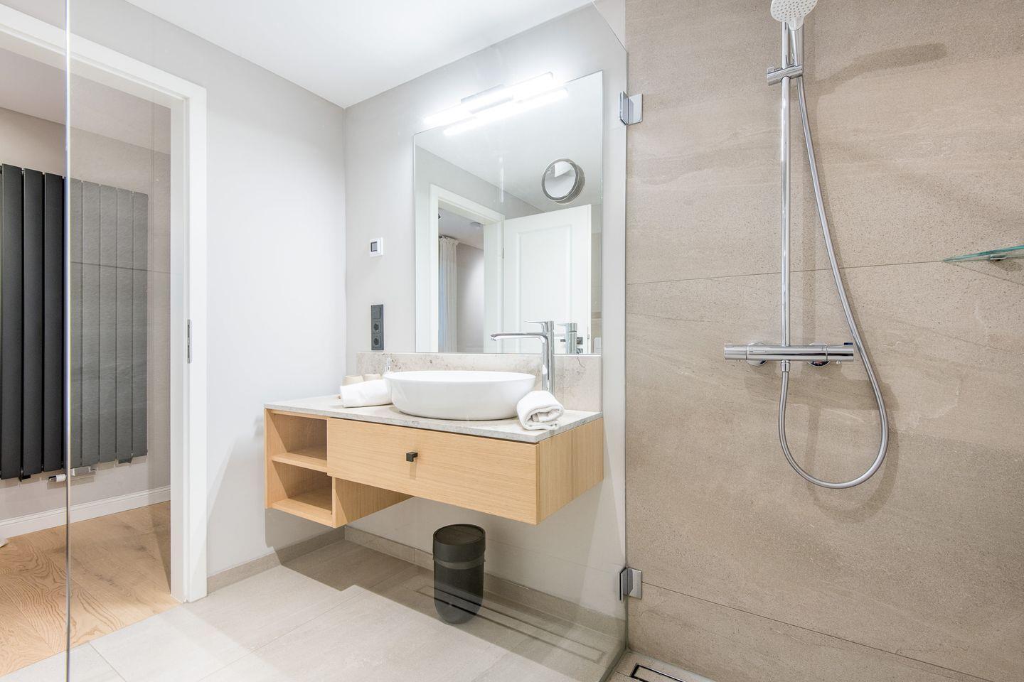 Im Untergeschoss befindet sich das Badezimmer mit ebenerdiger Dusche, WC, Föhn und Handtuchwärmer. Ein zusätzliches Gäste-WC im Erdgeschoss rundet das durchdachte Raumkonzept ab.