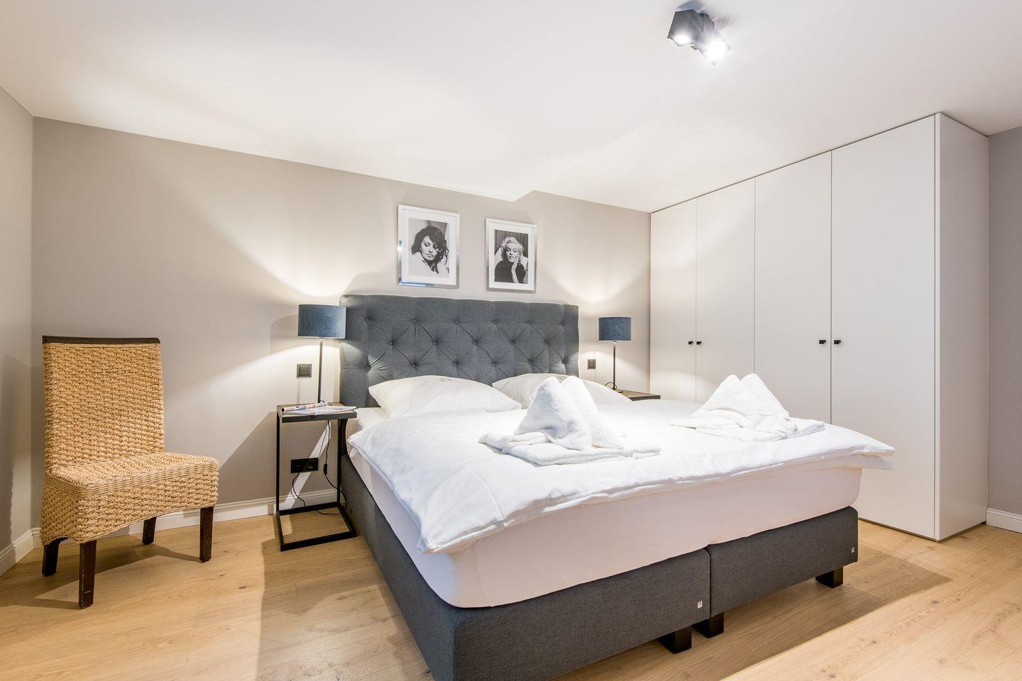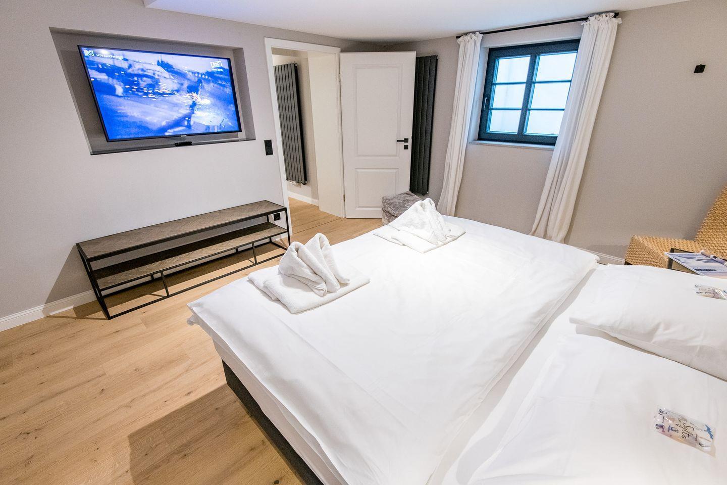 Zwei geschmackvoll eingerichtete Schlafzimmer im Untergeschoss verfügen jeweils über ein großes Boxspringbett (180x200 cm) und einen TV. Die Schlafzimmer bieten angenehme Rückzugsorte und viel Komfort für erholsame Nächte.