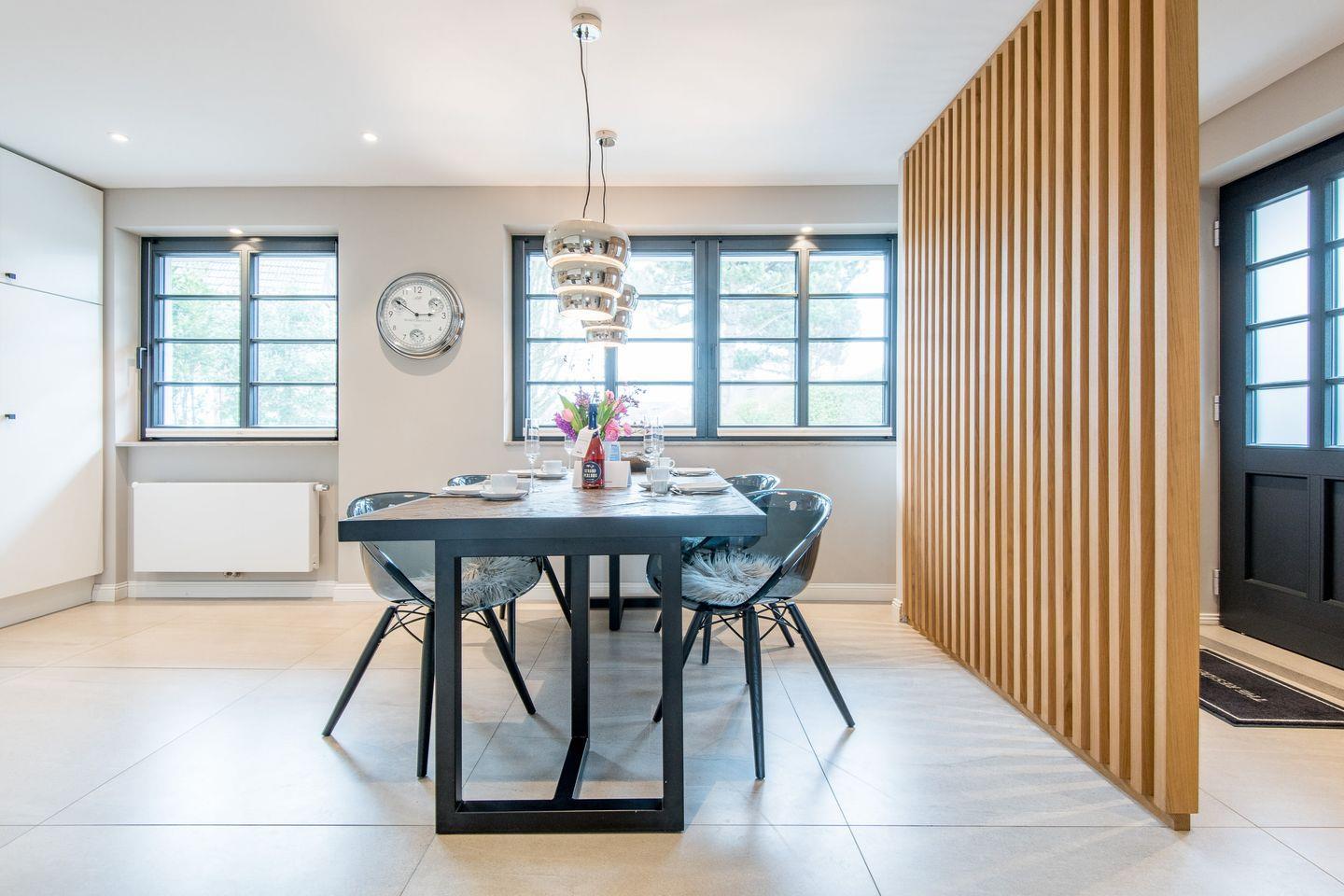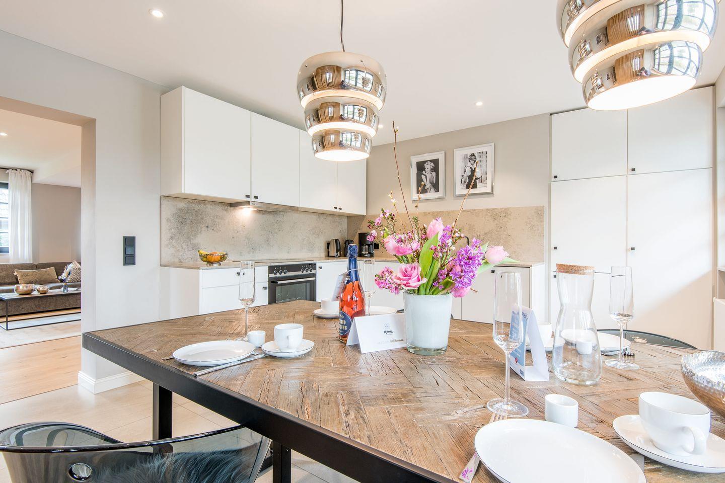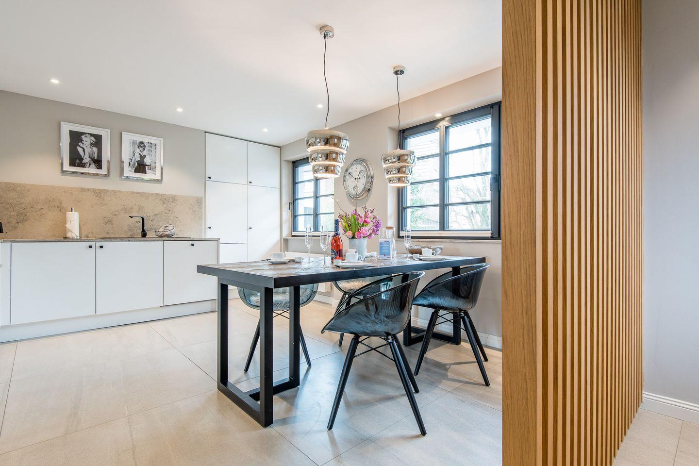 Die halboffene Küche ist bestens ausgestattet und bietet u.a. einen Backofen, Geschirrspüler sowie eine Filterkaffeemaschine und eine Nespresso-Maschine. Der angrenzende Essbereich bietet Platz für gemeinsame Mahlzeiten und gemütliche Abende.