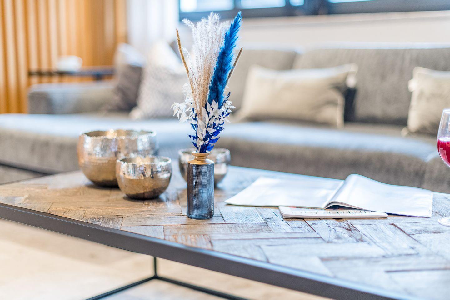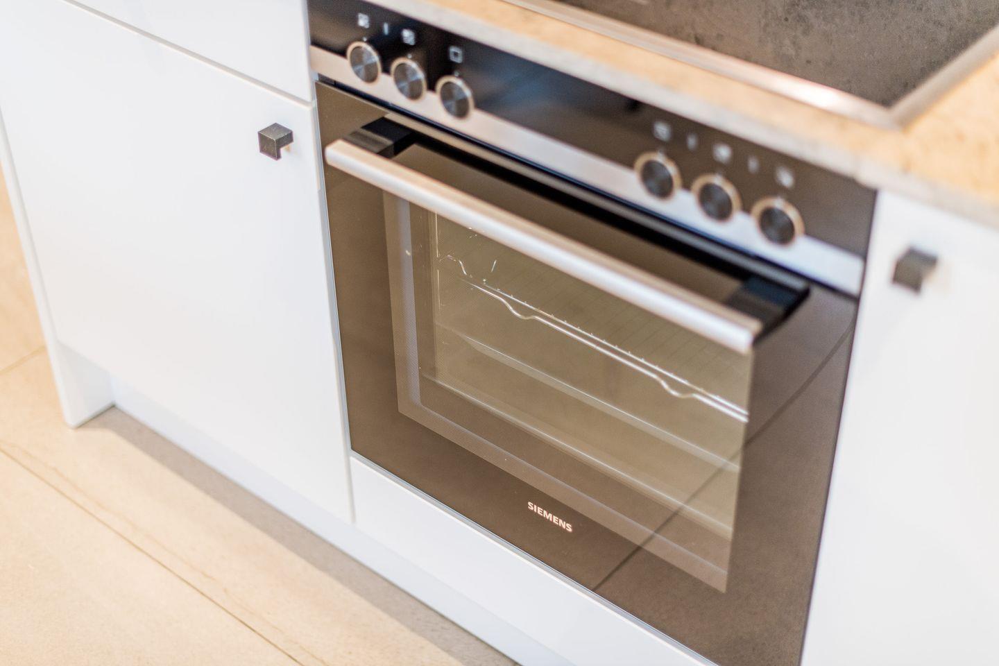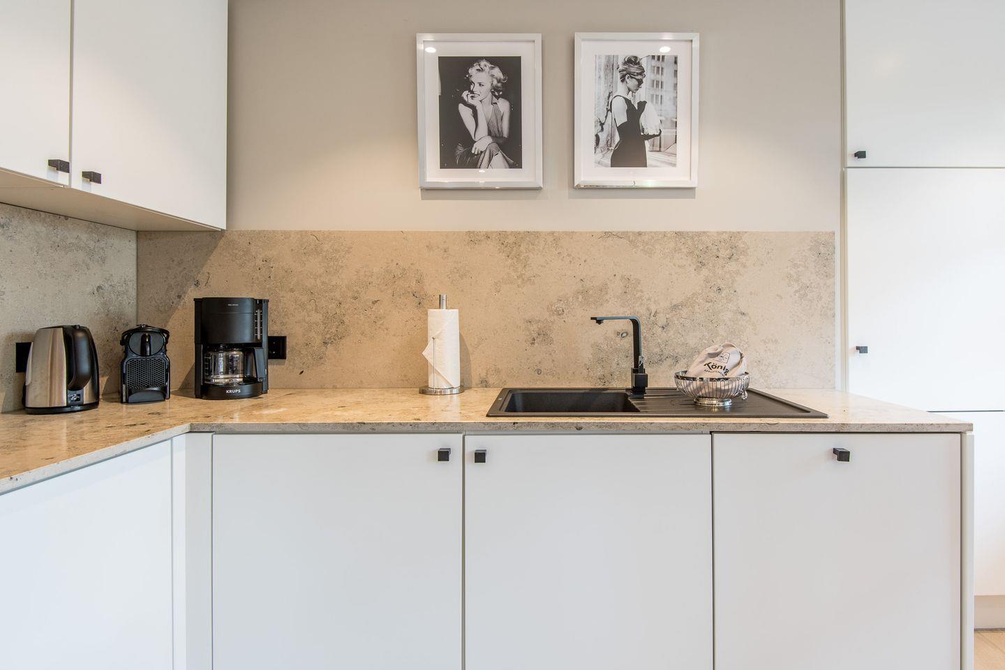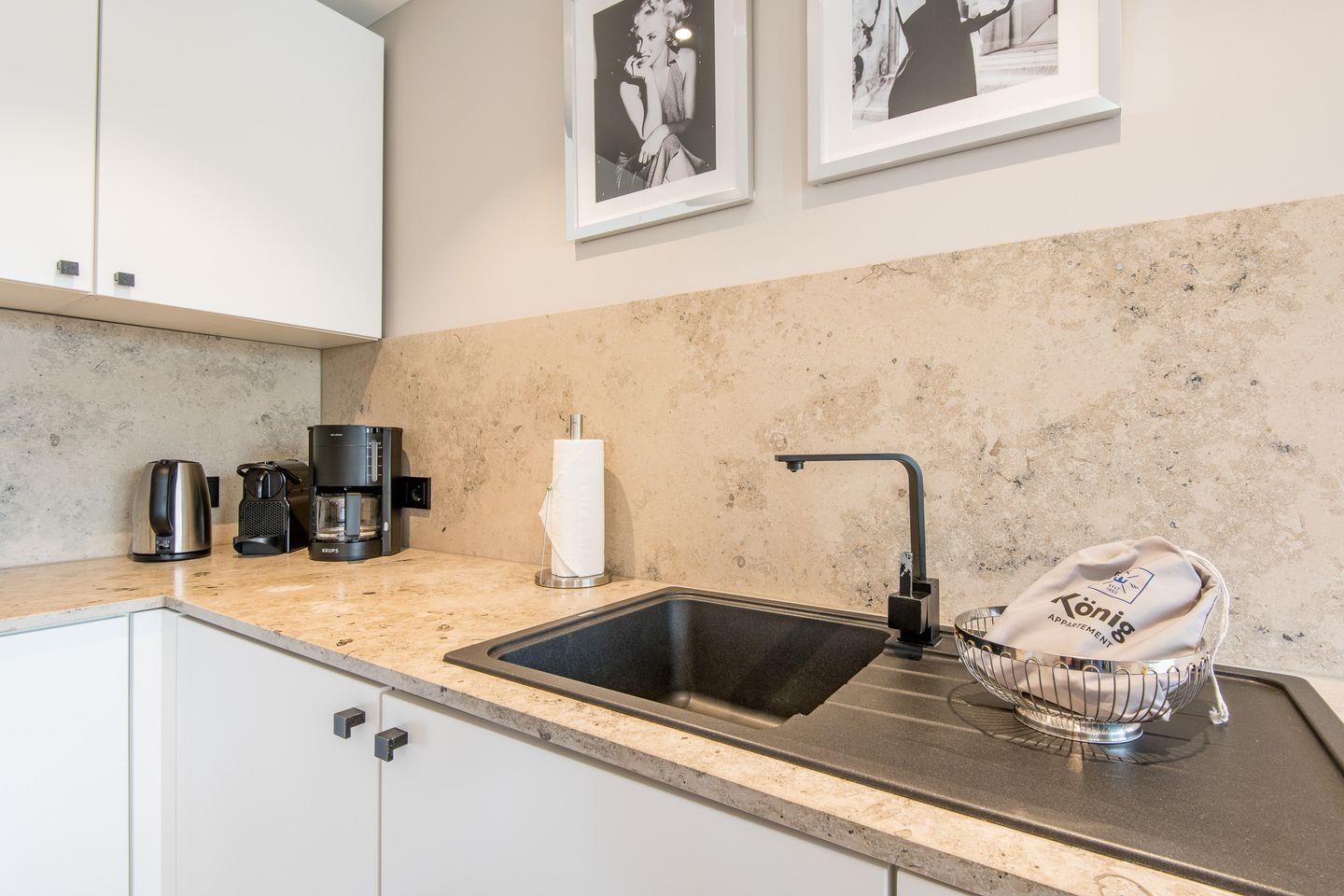 Die halboffene Küche ist bestens ausgestattet und bietet u.a. einen Backofen, Geschirrspüler sowie eine Filterkaffeemaschine und eine Nespresso-Maschine. Der angrenzende Essbereich bietet Platz für gemeinsame Mahlzeiten und gemütliche Abende.