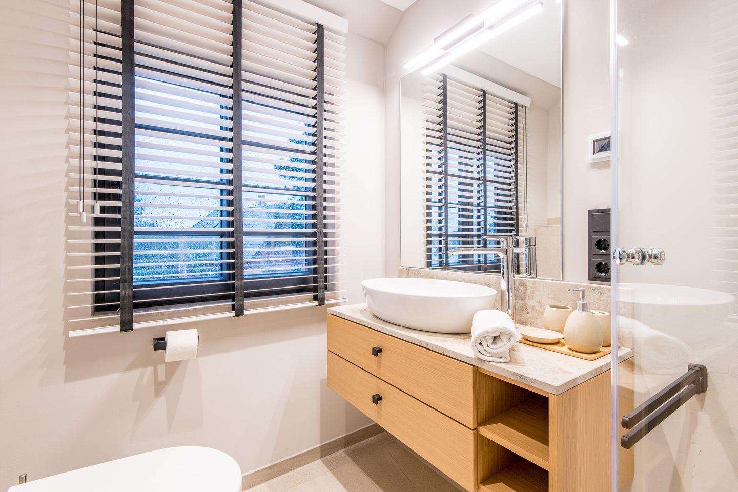 Zwei modern gestaltete Badezimmer, eines davon en Suite, stehen Ihnen zur Verfügung. Das Hauptbadezimmer im Obergeschoss ist mit einer ebenerdigen Dusche, WC, Föhn und Handtuchwärmer ausgestattet, und sorgt für Komfort und Erfrischung.