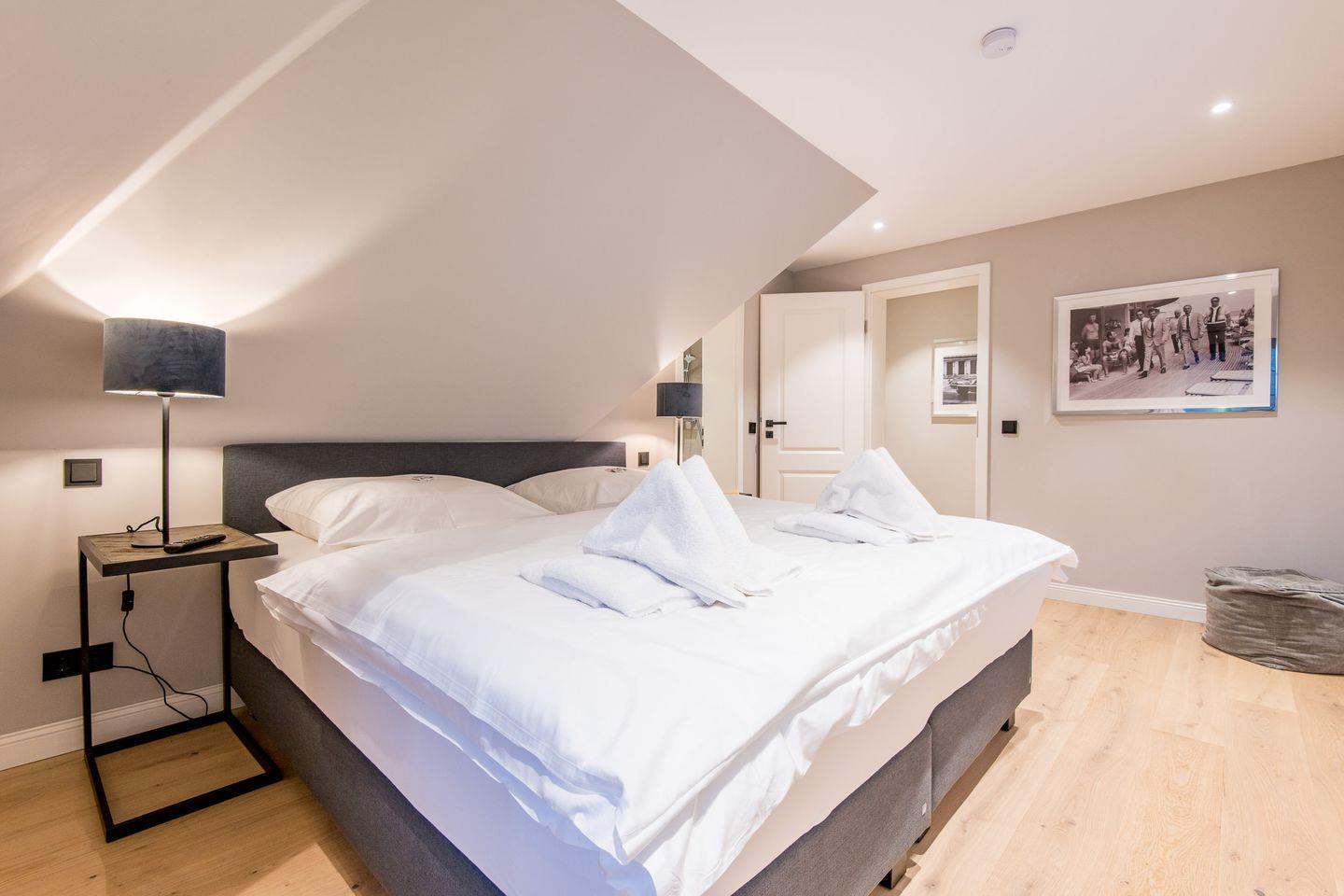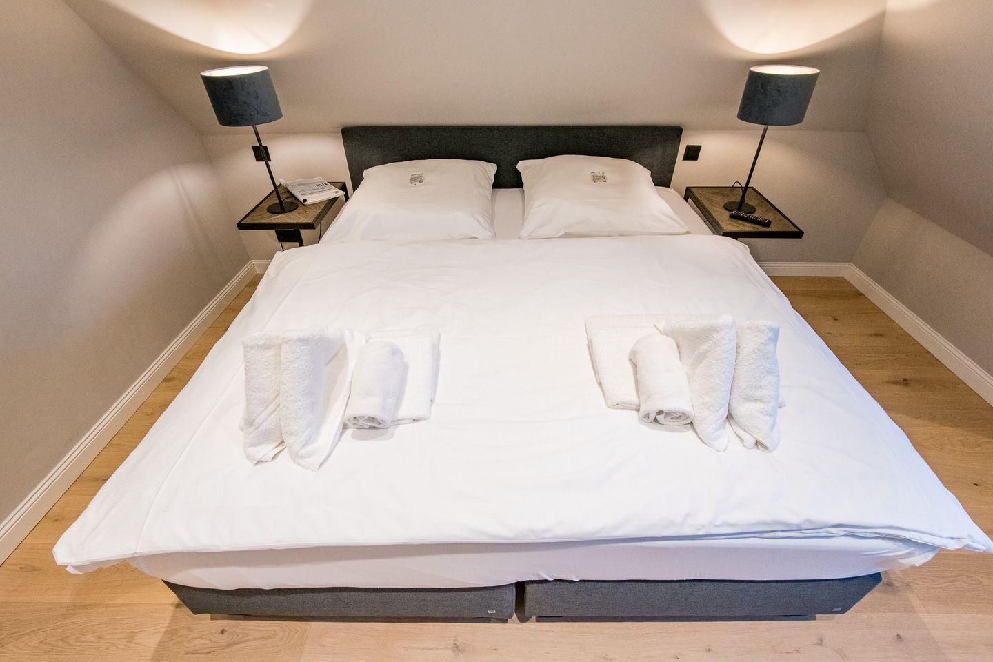 Die zwei geräumigen Schlafzimmer bieten jeweils ein komfortables Boxspringbett (180x200 cm) und einen eigenen TV. Das erste Schlafzimmer verfügt über ein Badezimmer en Suite und garantiert so maximale Privatsphäre. Ein dritter Raum im Dachgeschoss bietet zusätzlichen Platz und kann als Rückzugsort genutzt werden.