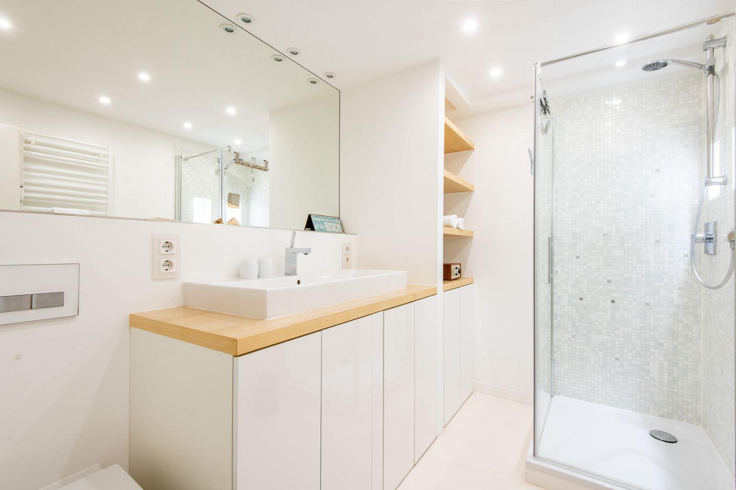 Das helle Badezimmer verfügt über eine Dusche, WC und einen Handtuchwärmer und bietet Ihnen nach einem erlebnisreichen Tag auf der Insel den Komfort, den Sie sich wünschen.
