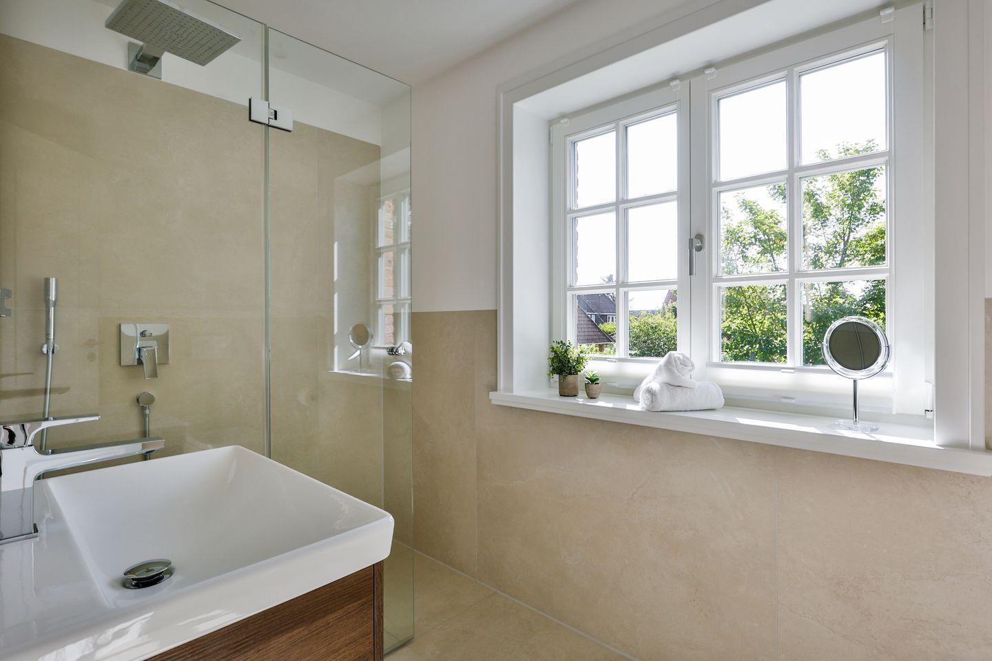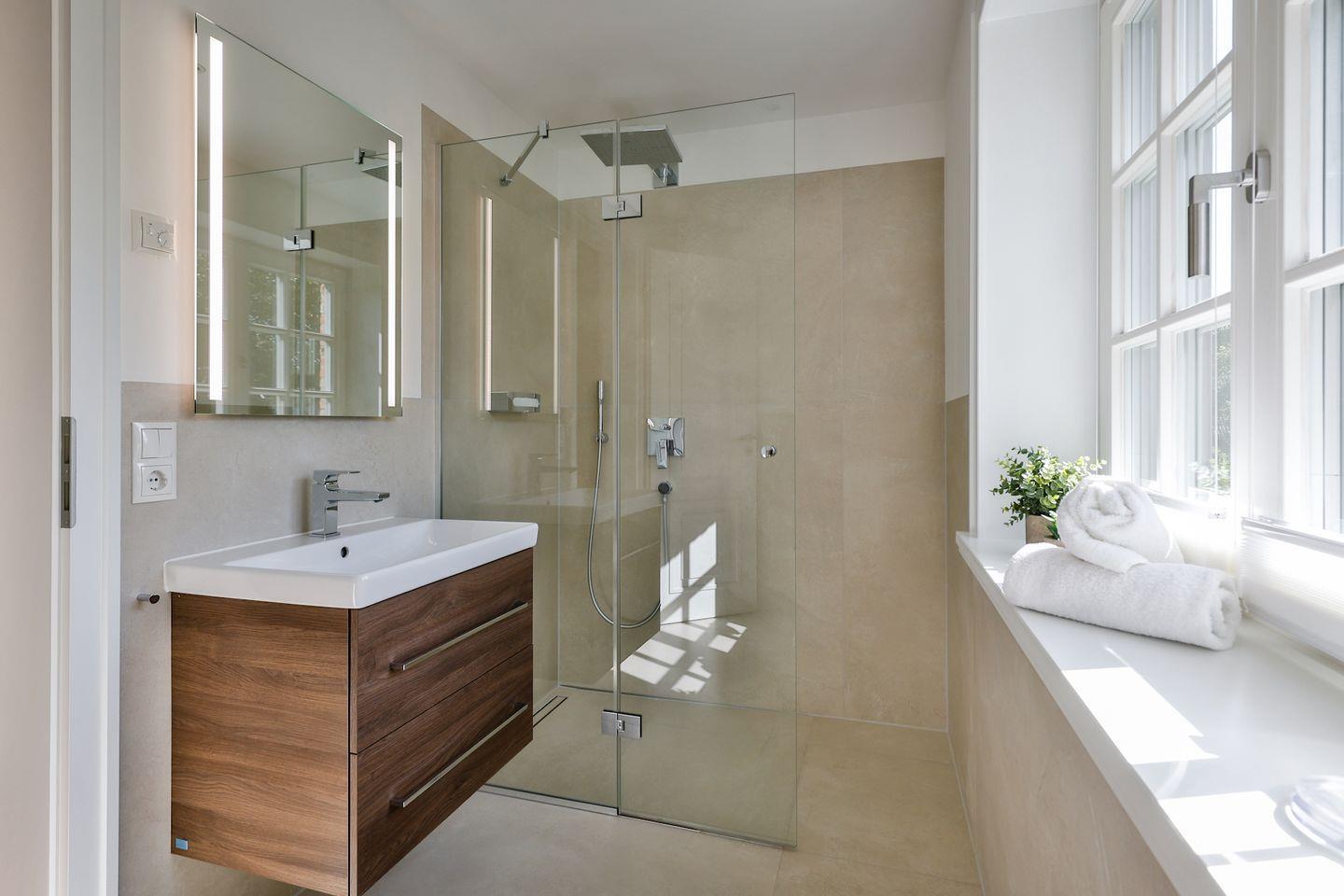 Das Hauptbadezimmer ist ein modernes Duschbad mit WC, Föhn und Handtuchwärmer. Ein zweites Badezimmer mit Dusche und WC sowie ein zusätzliches Gäste-WC erhöhen den Komfort und bieten Privatsphäre für alle Gäste.