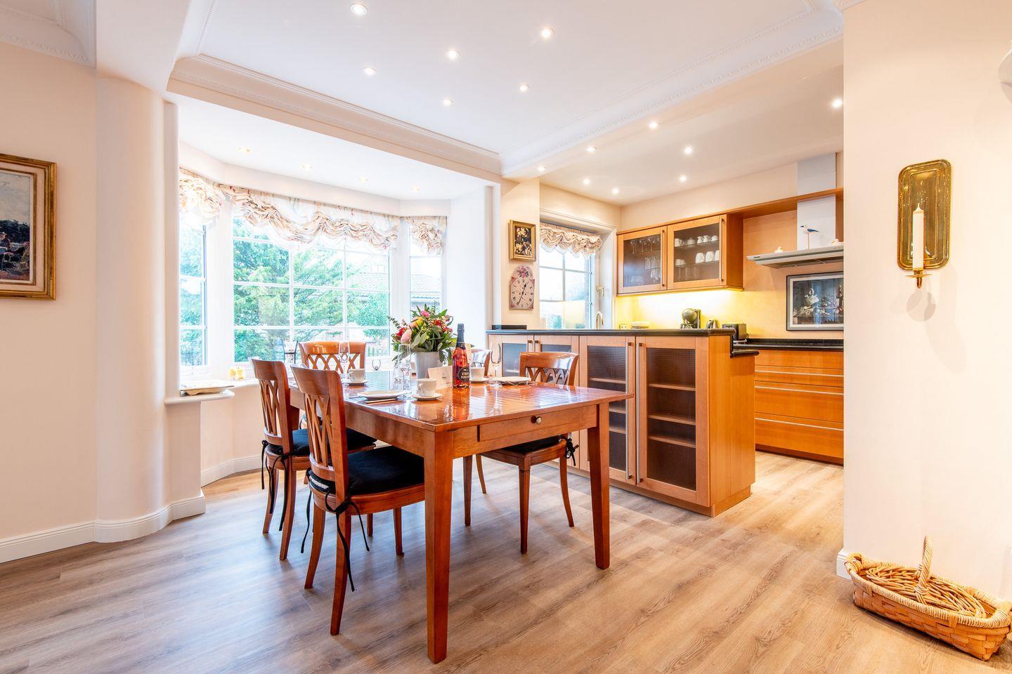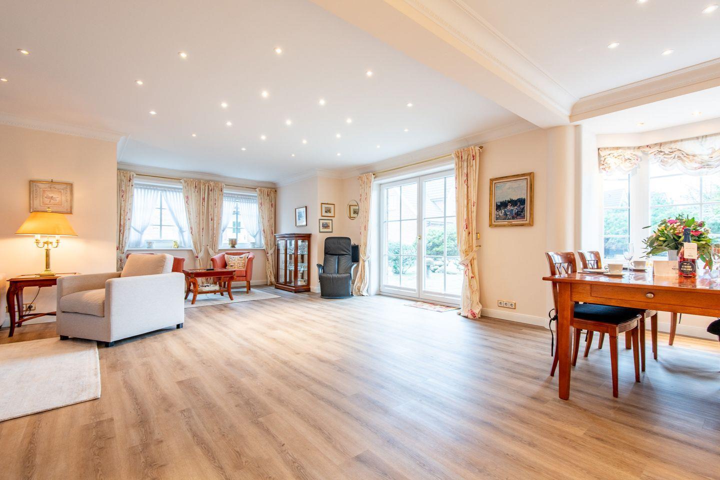 Das großzügige, lichtdurchflutete Wohnzimmer lädt mit einem komfortablen Schlafsofa und einem eleganten Mylin-Kamin zum Verweilen ein. Vom Wohnzimmer aus gelangen Sie direkt zur Westterrasse und in den gepflegten Garten. Hier erwarten Sie hochwertige Gartenmöbel, die zum entspannten Verweilen in der Nachmittagssonne einladen. Der angrenzende Essbereich ist stilvoll gestaltet und die offene Küche bietet alles, was Sie für eine komfortable Selbstverpflegung benötigen.