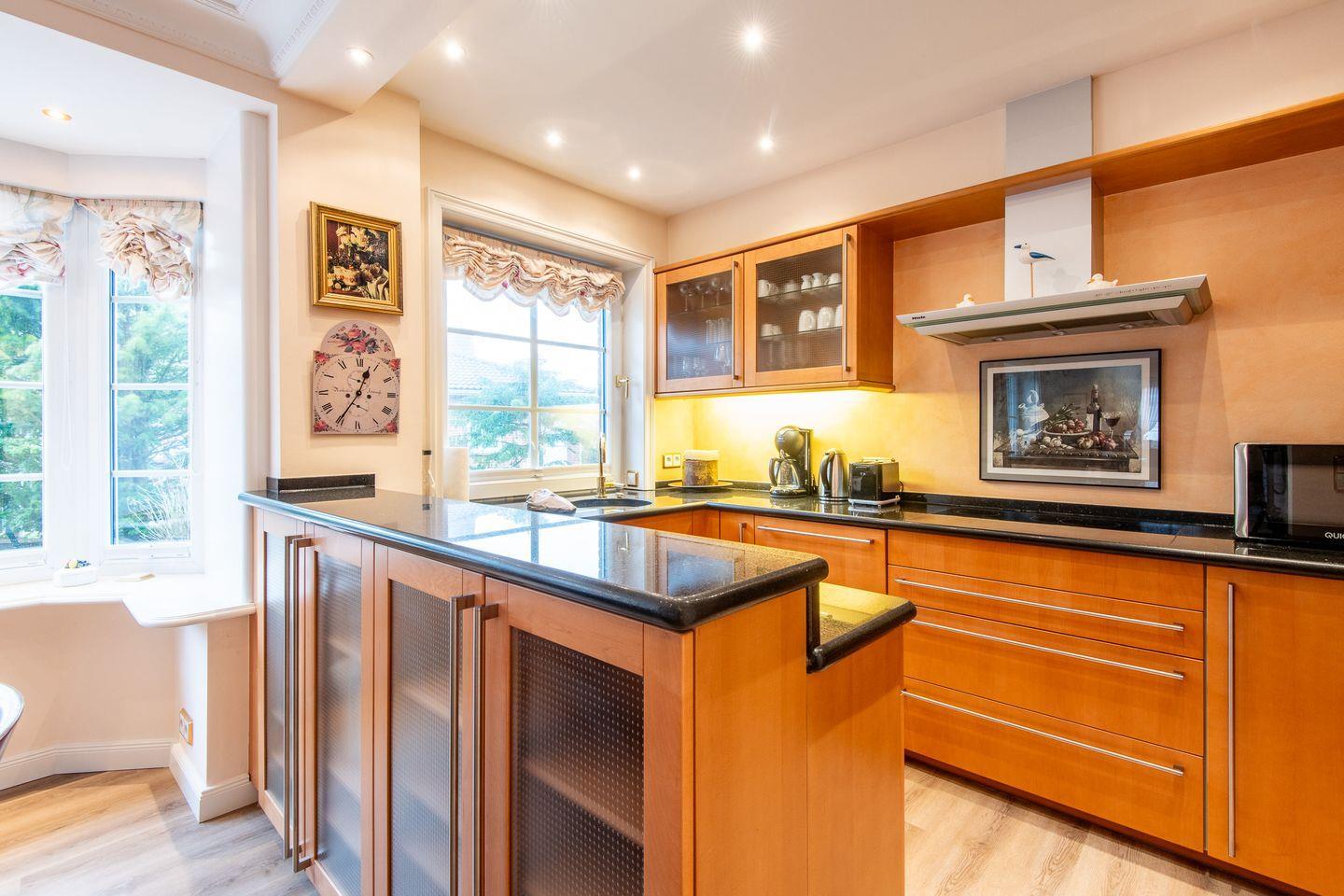Im Untergeschoss lädt ein exklusiver Wellnessbereich mit Sauna zur Entspannung ein. Der Hauswirtschaftsraum mit Waschmaschine, Trockner und großem Weinschrank bietet zusätzliche Annehmlichkeiten für einen komfortablen Aufenthalt.
