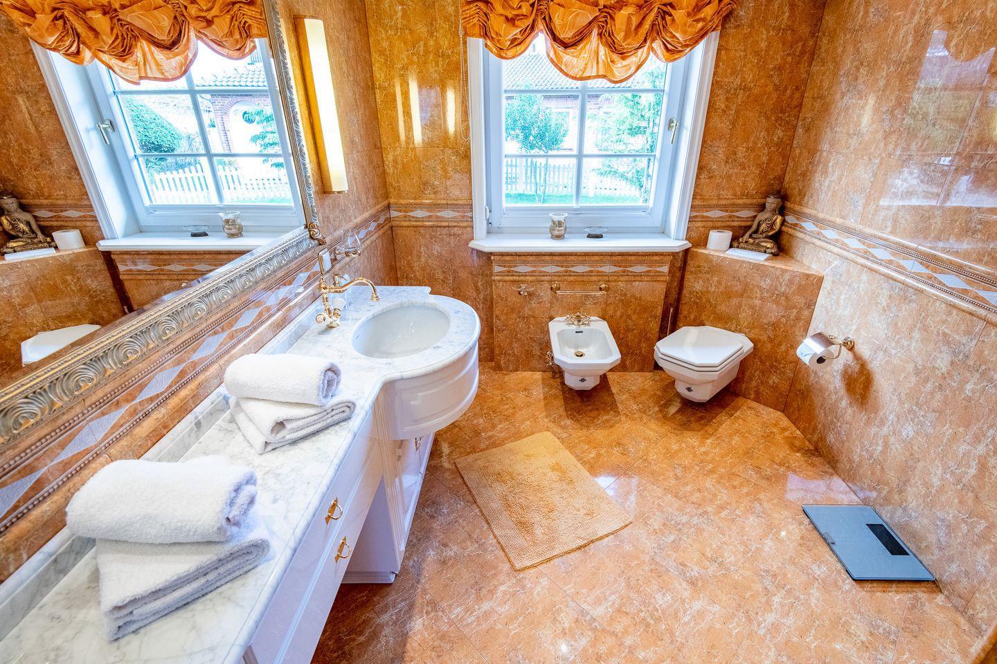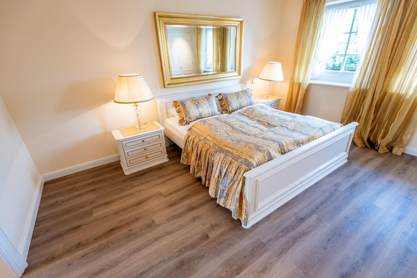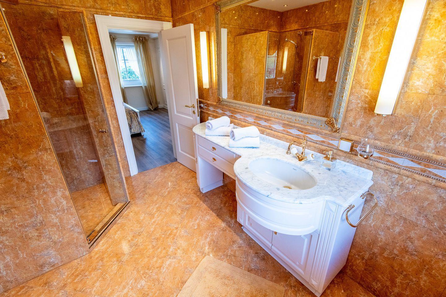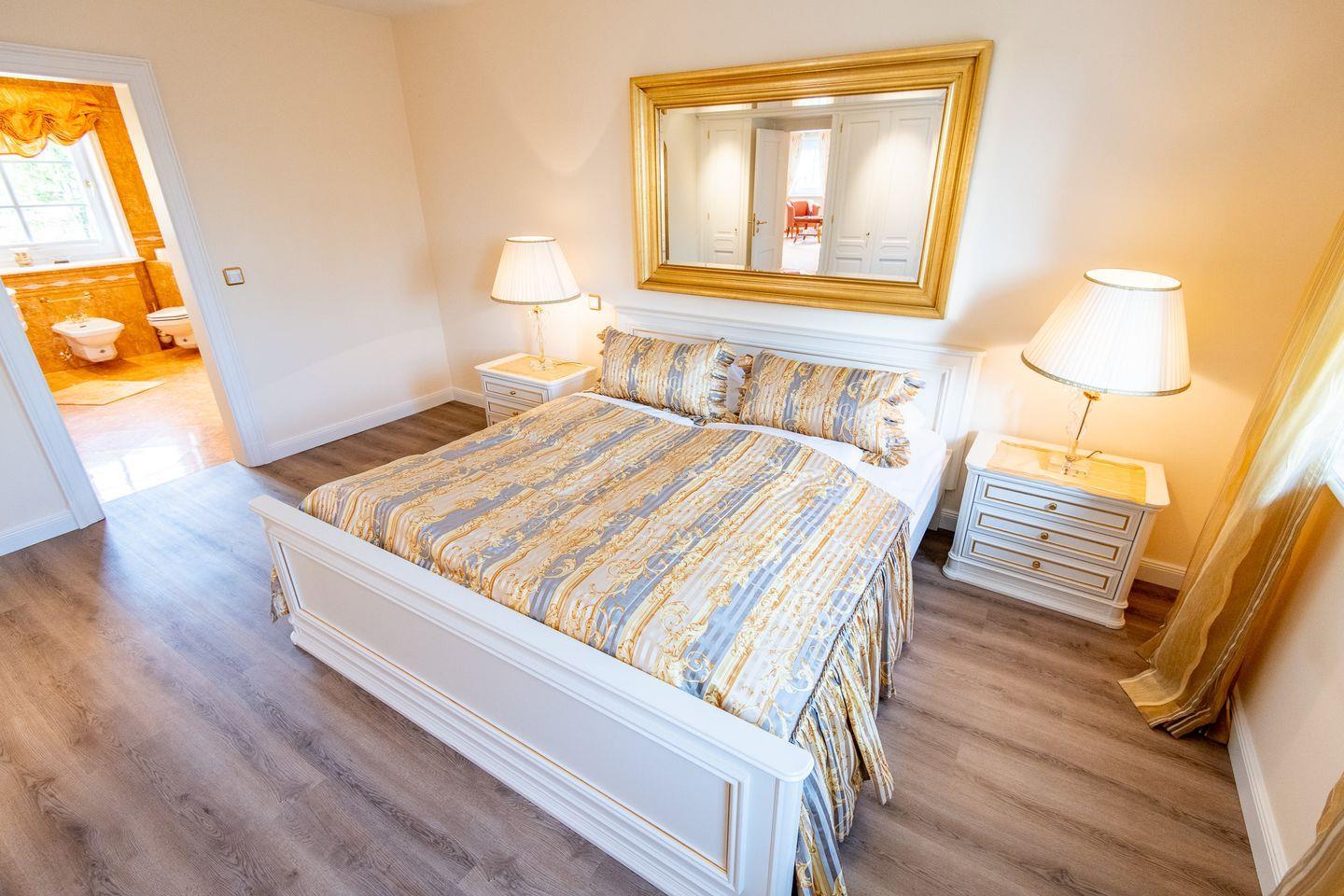 Das Hauptschlafzimmer ist mit einem gemütlichen Doppelbett (180x200 cm), einem TV und einem großzügigen Kleiderschrank ausgestattet und verfügt über einen direkten Zugang zum Badezimmer. Auch das zweite Schlafzimmer bietet ein Doppelbett (180x200 cm), TV, Kleiderschrank und ebenfalls einen eigenen Zugang zu einem modernen Badezimmer. Beide Badezimmer sind luxuriös gestaltet: Das erste Badezimmer verfügt über eine ebenerdige Dusche und ein Bidet, das zweite Badezimmer bietet eine großzügige Dusche.