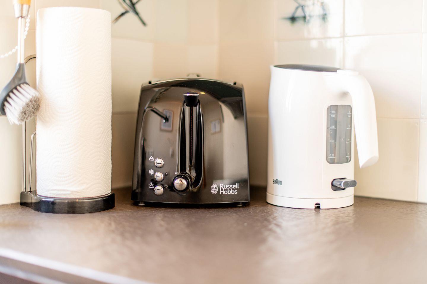 Die offene Küche ist modern ausgestattet und bietet alles Nötige für die Zubereitung Ihrer Lieblingsgerichte – inklusive einer Mikrowelle mit Backofenfunktion, die zusätzlichen Komfort bietet.