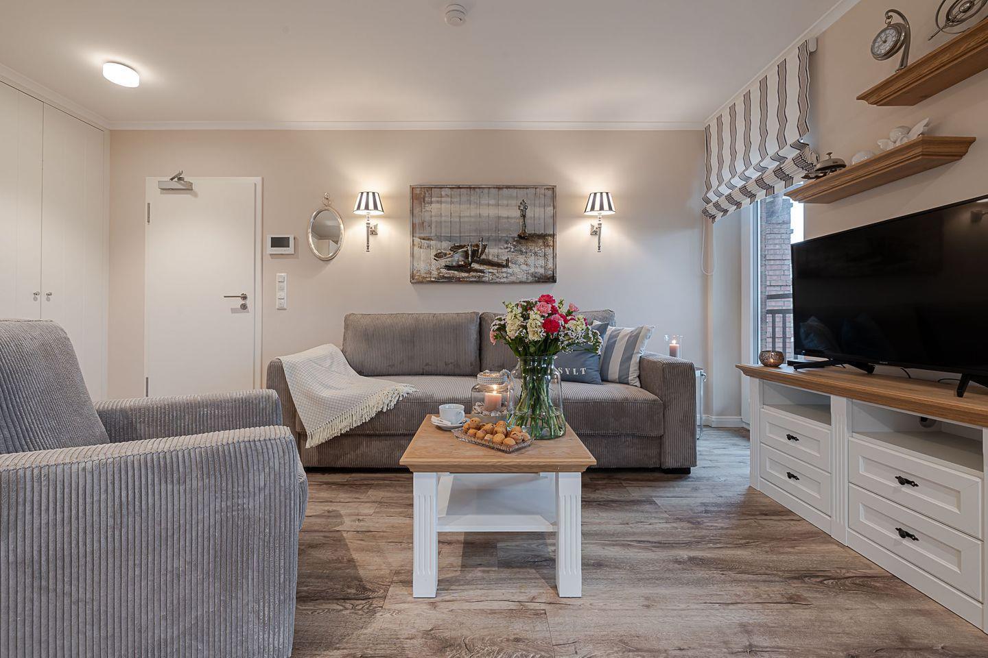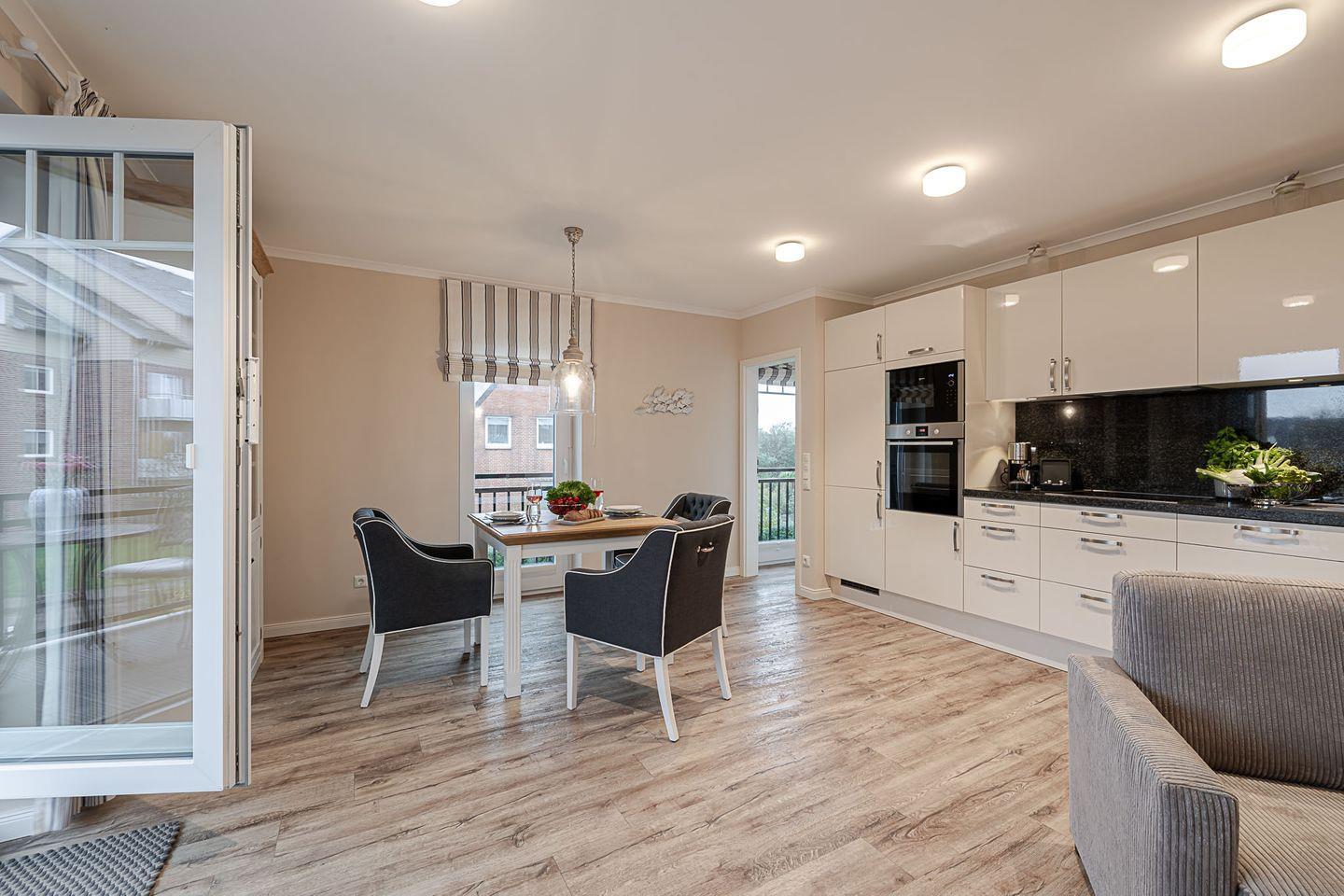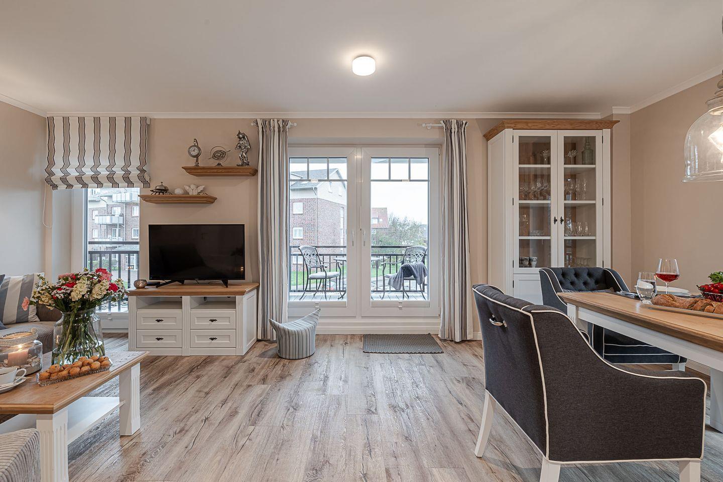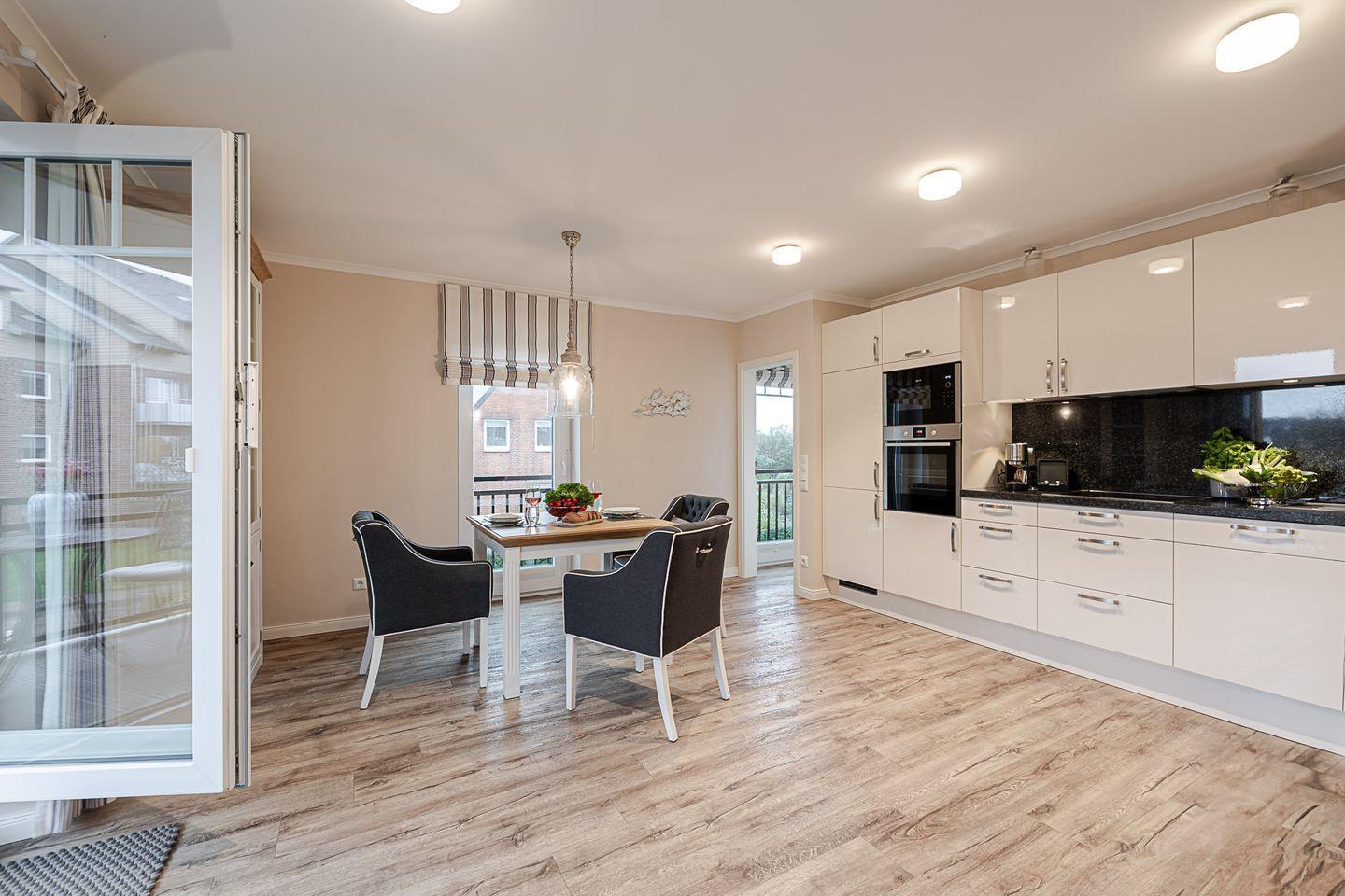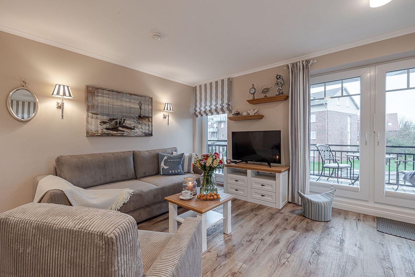 Ein besonderes Highlight ist der sonnige Westbalkon, der auch bei norddeutschem Wetter durch seine geschützte Lage oft zum Verweilen im Freien einlädt – ideal, um die frische Nordseeluft zu genießen.