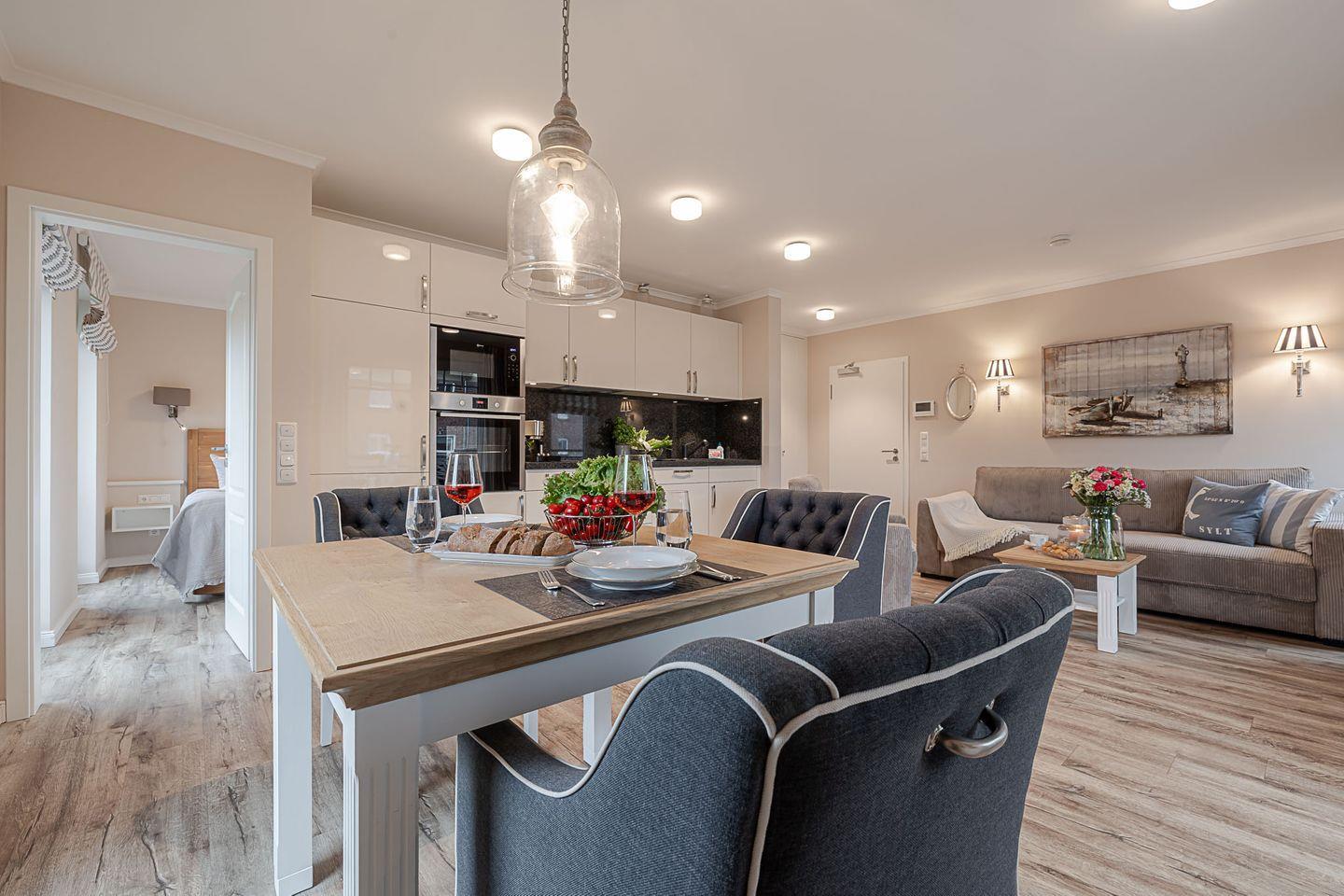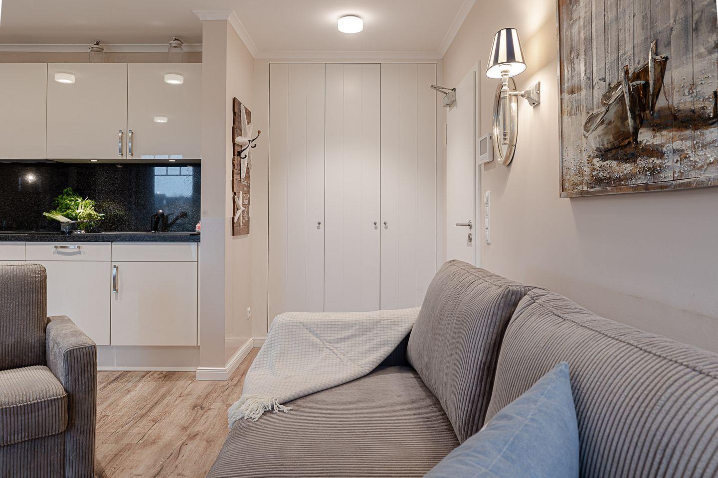 Die barrierefreie 51?m² große Ferienwohnungerwohnung ist bequem per Aufzug erreichbar und bietet Platz für bis zu 3 Personen. Neben einem separaten Schlafzimmer überzeugt der lichtdurchflutete Wohn-Essbereich mit stilvollem Interieur und einem komfortablen Schlafsofa. Die moderne Küche ist voll ausgestattet und lädt zum gemeinsamen Kochen ein.