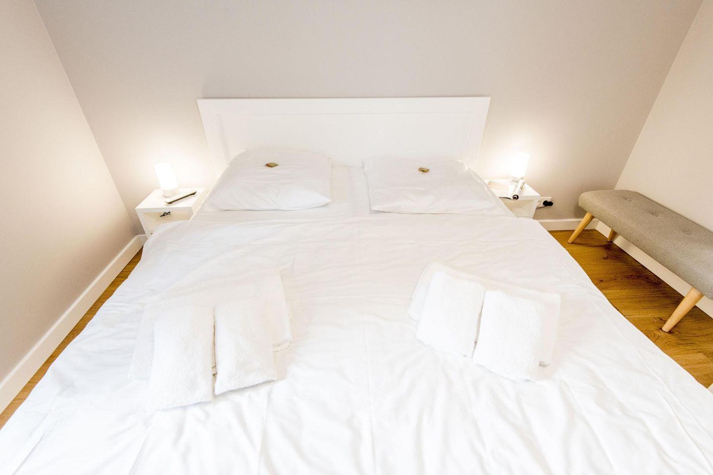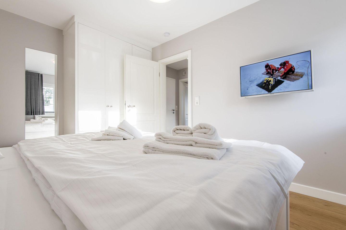 Das komfortable Schlafzimmer ist mit einem großzügigen Doppelbett (2x 90x200 cm) und einem geräumigen Kleiderschrank ausgestattet. Hier finden Sie genügend Platz für Ihre Urlaubsgarderobe, und das ruhige Ambiente sorgt für eine erholsame Nachtruhe.