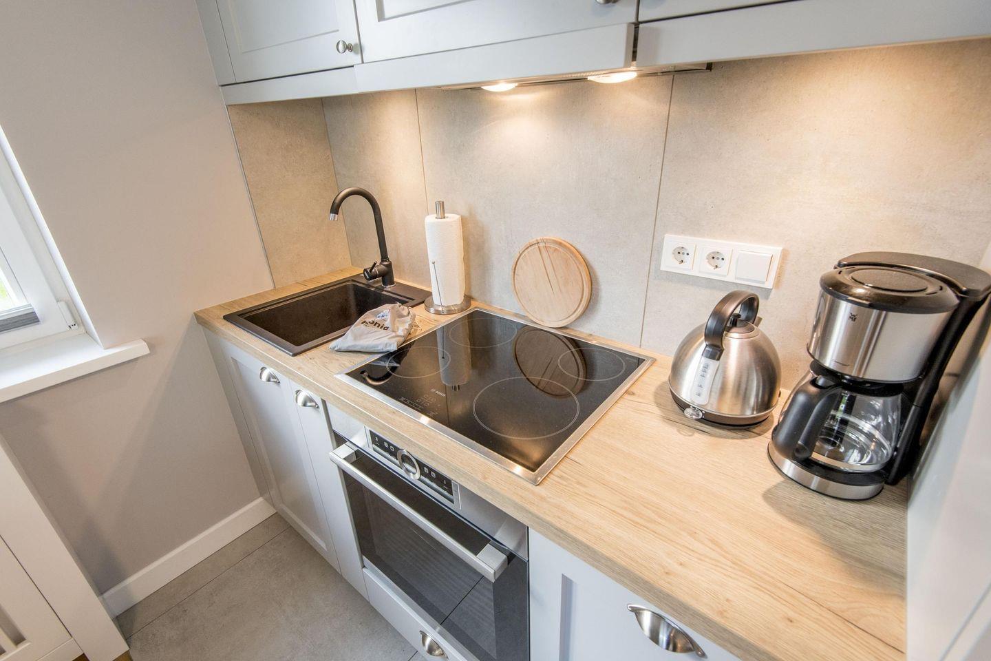 Die offen gestaltete Küche bietet mit ihrem Cerankochfeld und modernen Geräten alles, was Sie benötigen, um Ihre Lieblingsgerichte zuzubereiten. Der angrenzende Essbereich schafft eine gemütliche Atmosphäre für gemeinsame Mahlzeiten.