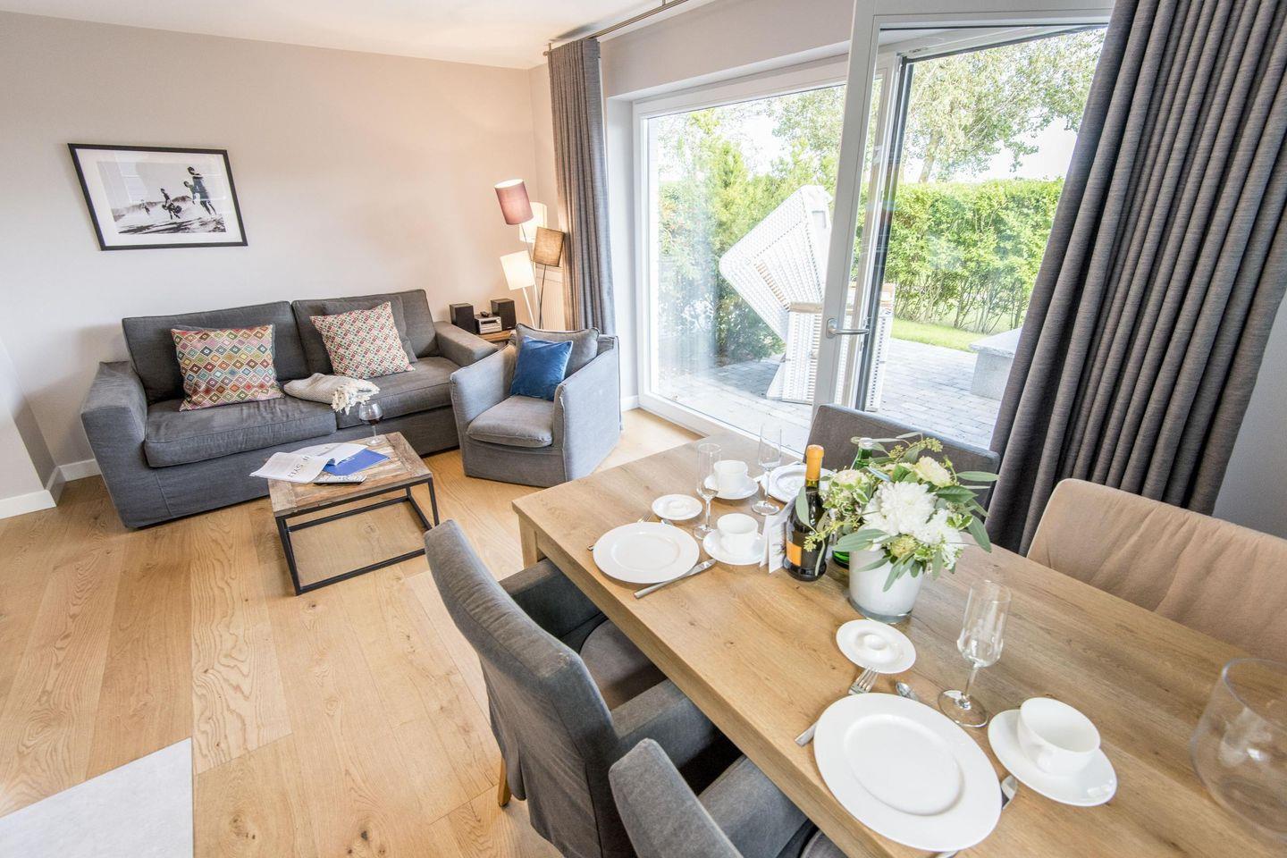 Im offenen Wohnbereich erwartet Sie eine gemütliche Schlafcouch, die ideal für einen dritten Gast geeignet ist. Vom Wohnzimmer gelangen Sie direkt auf die sonnige Südterrasse, die mit einem Strandkorb und bequemen Sitzmöglichkeiten ausgestattet ist. Hier können Sie die frische Nordseeluft und die Ruhe der Umgebung genießen – ideal für ein entspanntes Frühstück im Freien oder um den Tag ausklingen zu lassen.