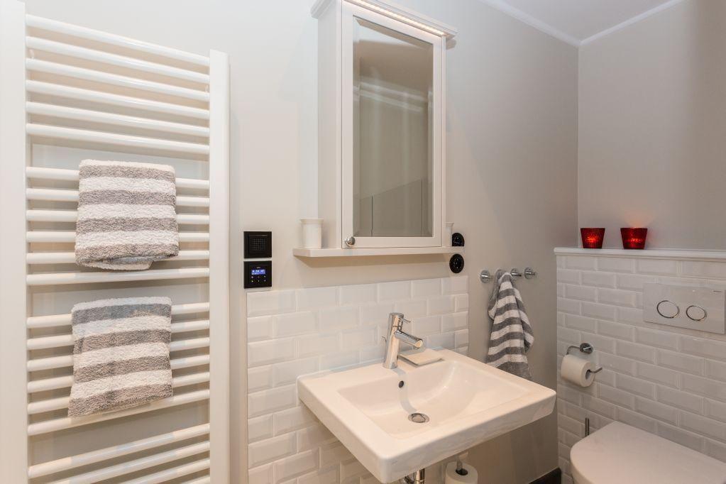 Das Badezimmer verfügt über eine ebenerdige Dusche, WC, einen Handtuchwärmer und einen Föhn, was den Raum zu einem praktischen und stilvollen Rückzugsort macht.