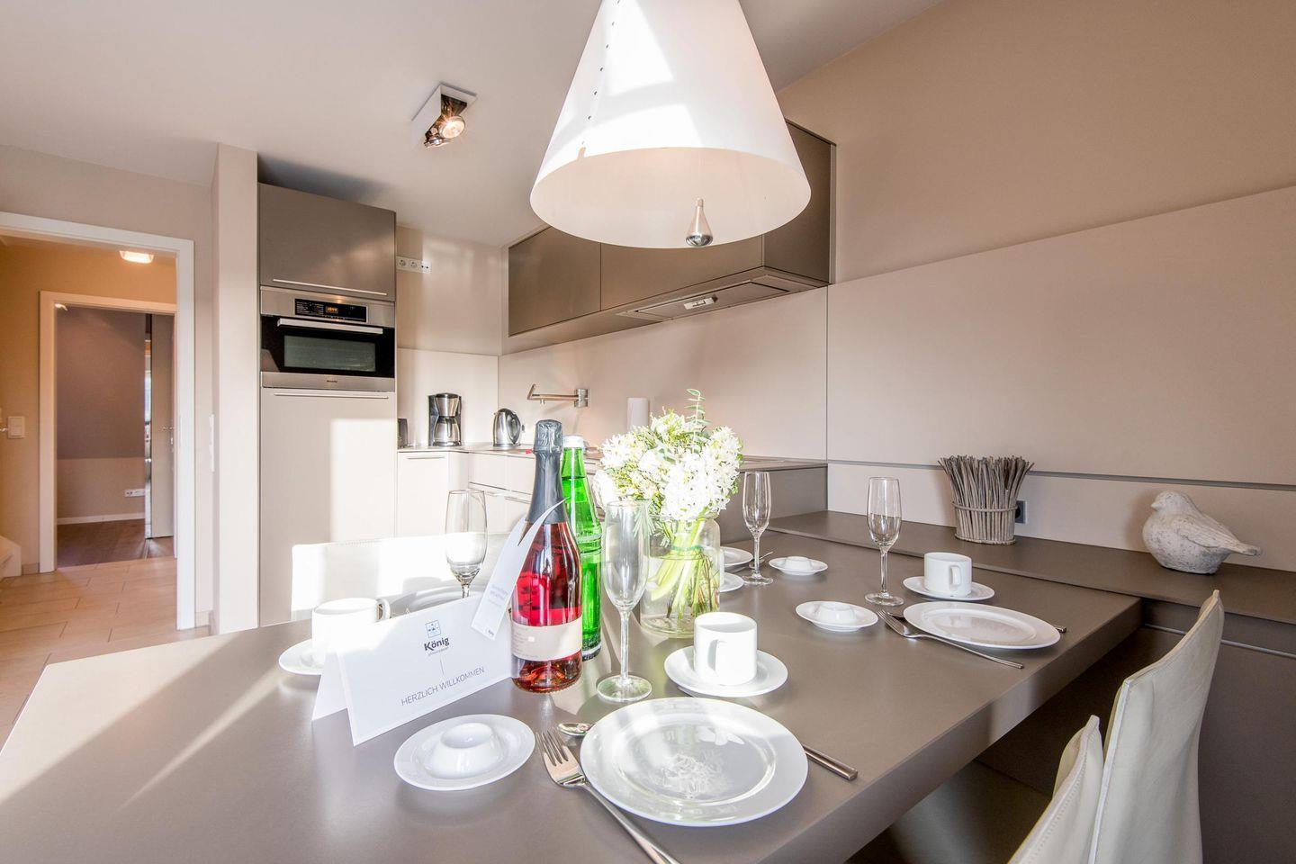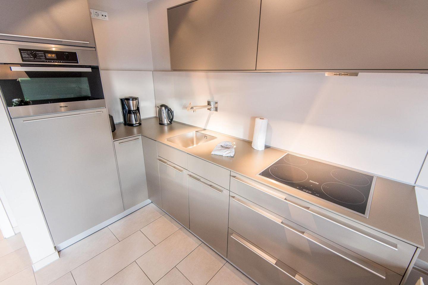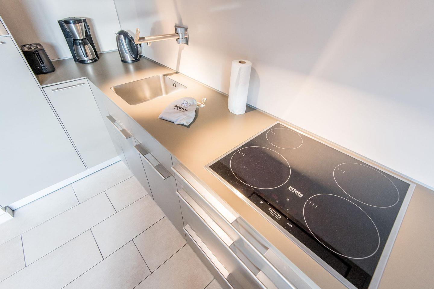 Die moderne, offene Küche ist mit einem Induktionsherd, Filterkaffeemaschine und allen wichtigen Geräten ausgestattet, um Ihnen einen komfortablen Aufenthalt zu ermöglichen.