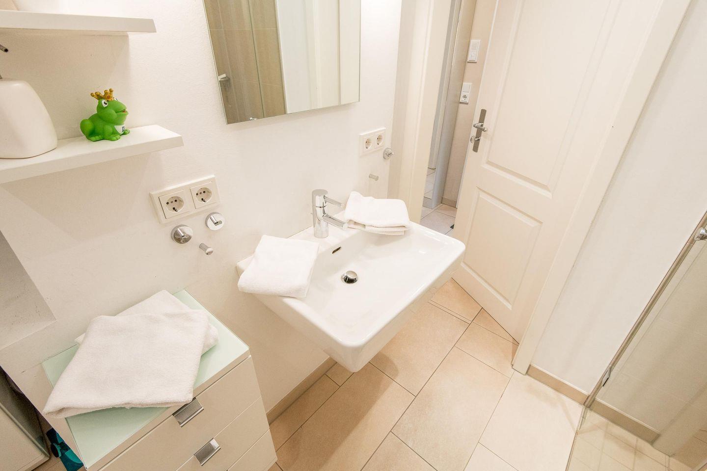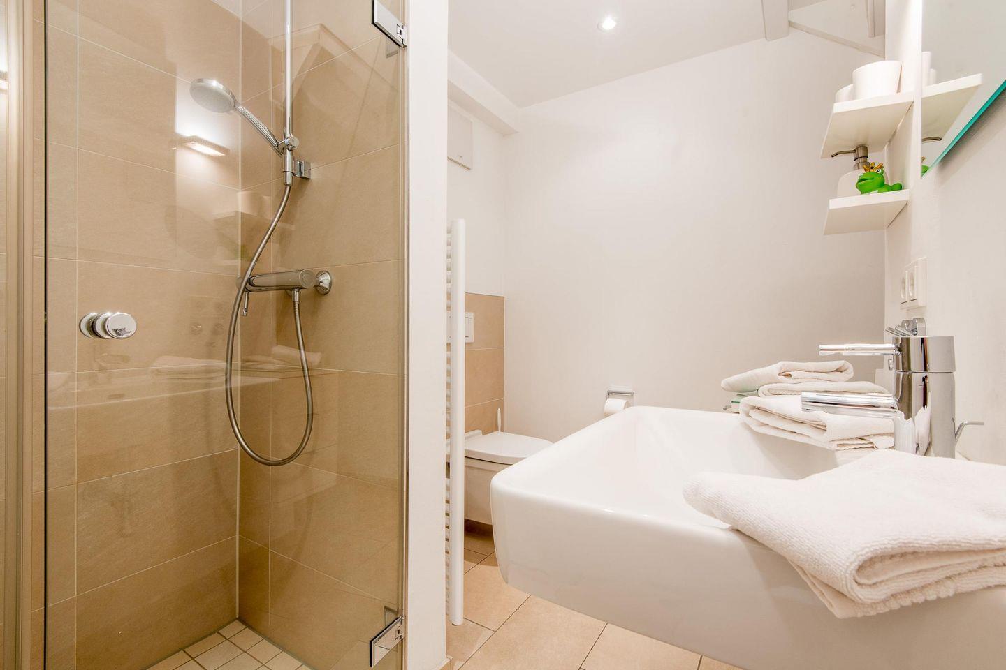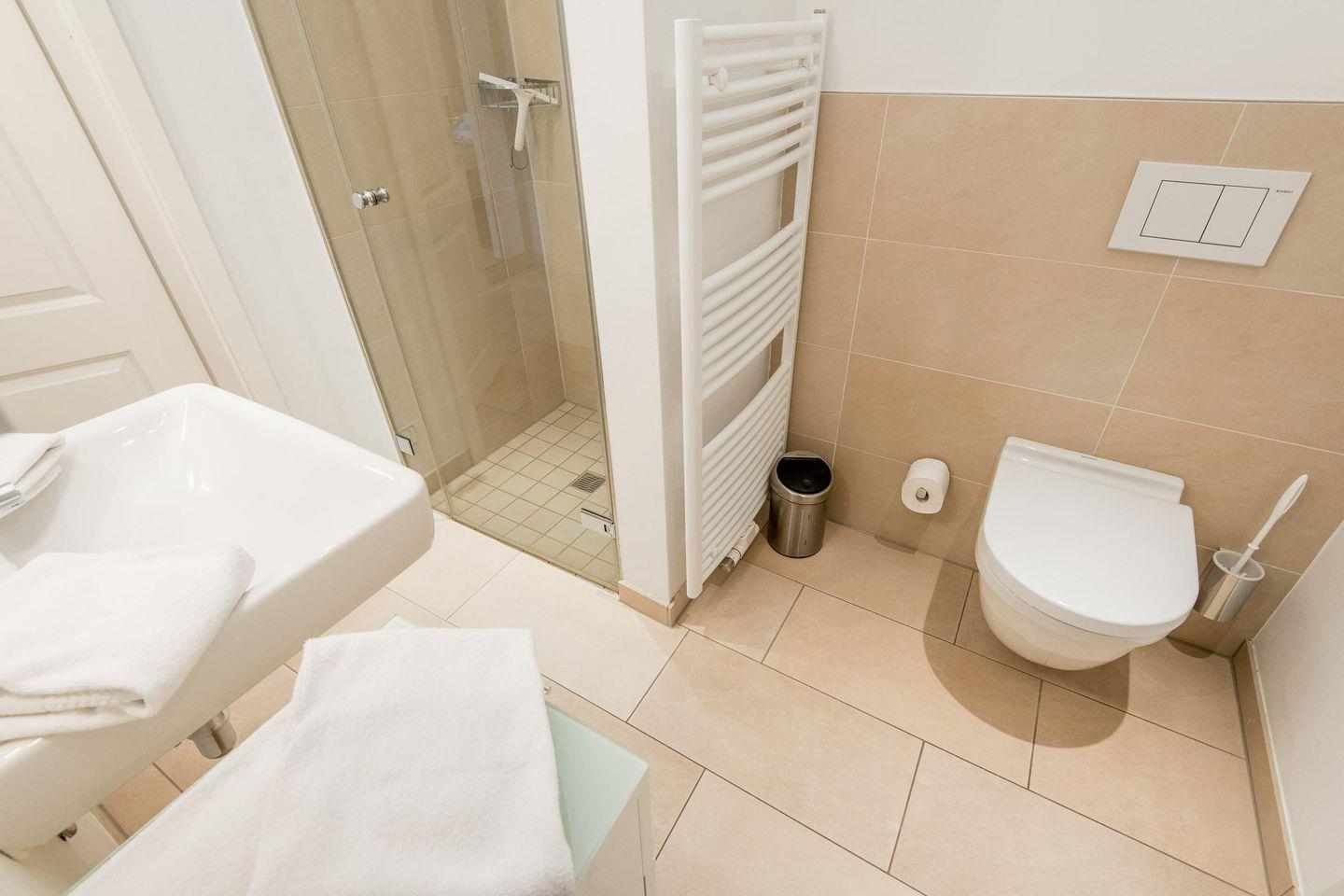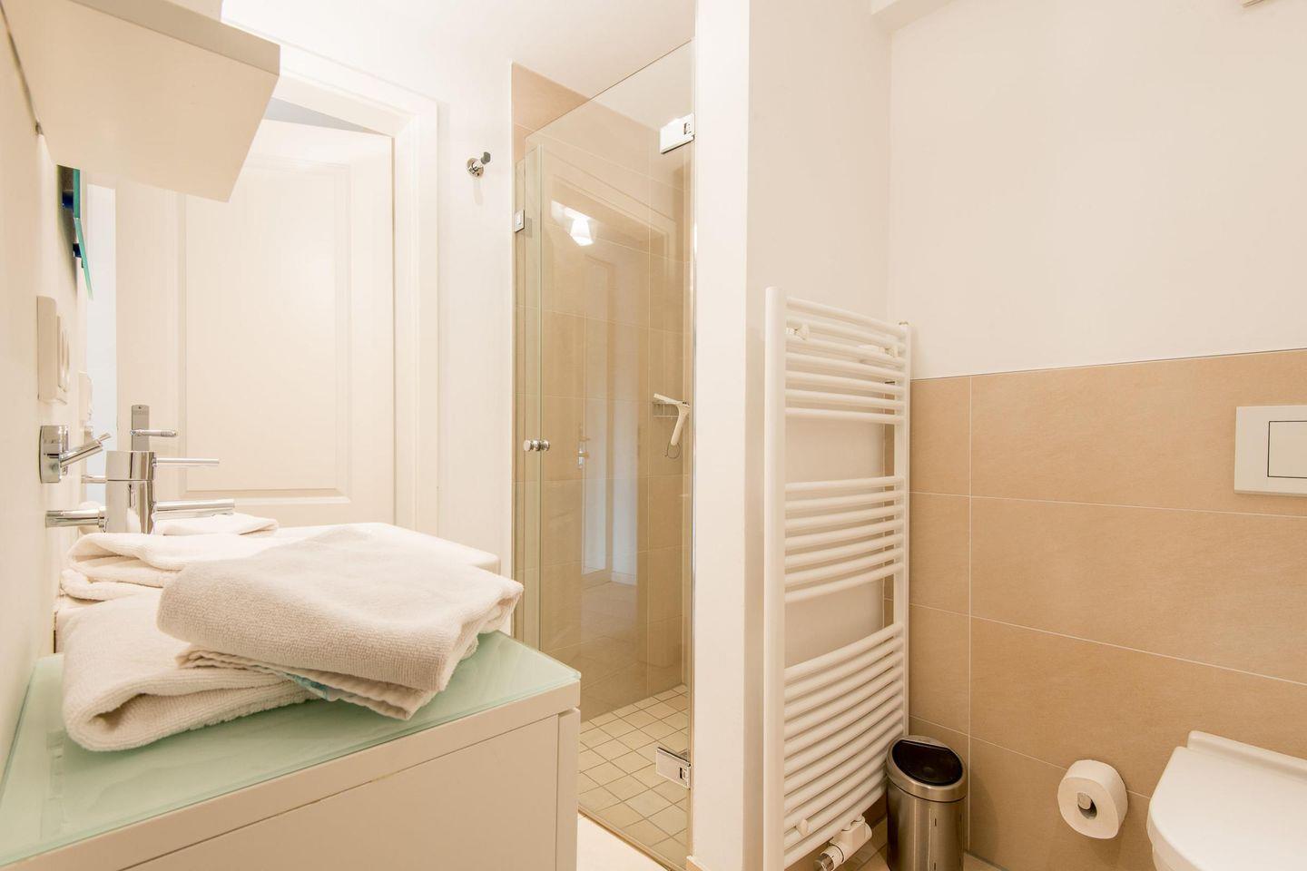 Das moderne Badezimmer ist mit einer ebenerdigen Dusche, WC, Handtuchwärmer, Föhn und einem Waschtrockner ausgestattet und bietet somit hohen Komfort.