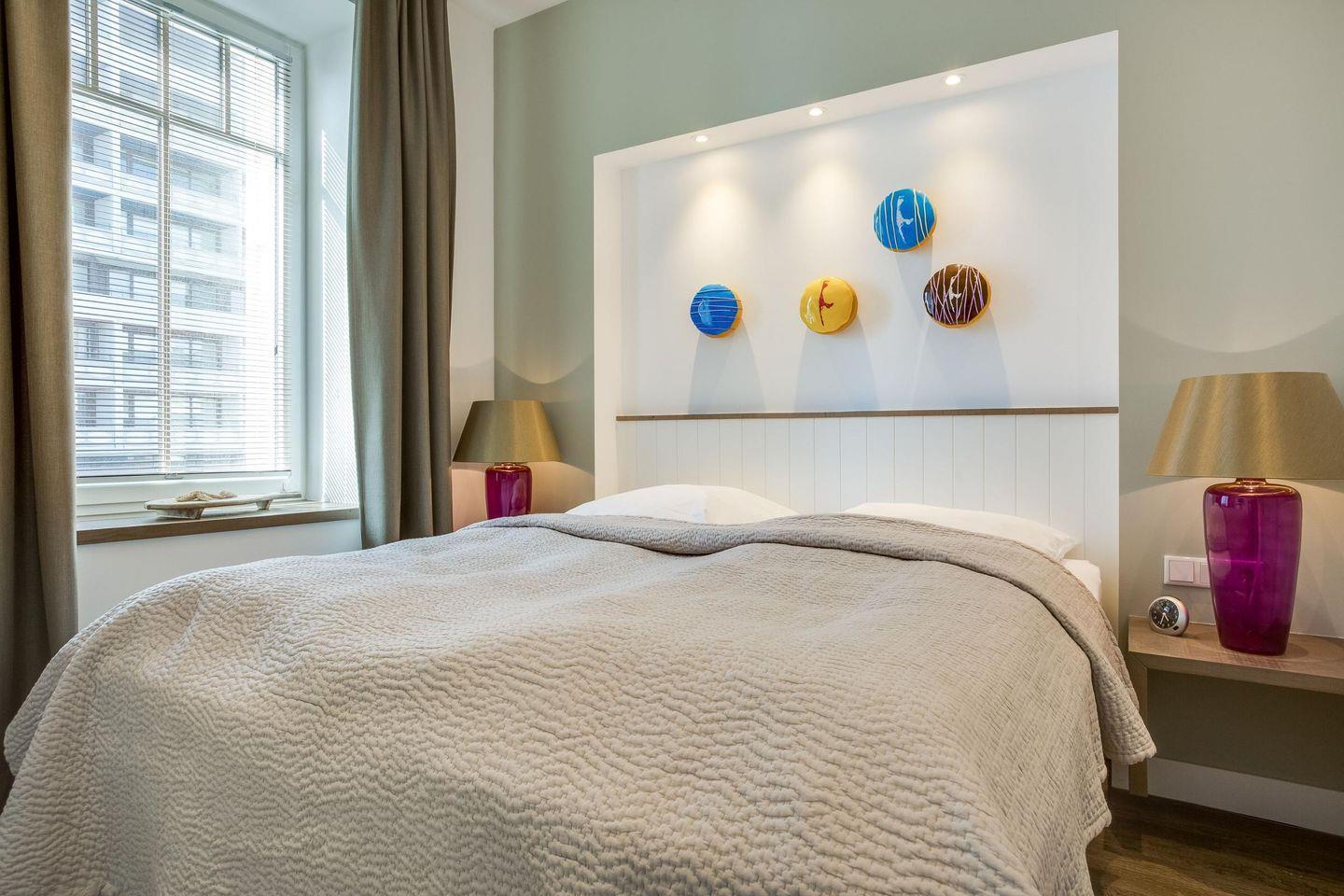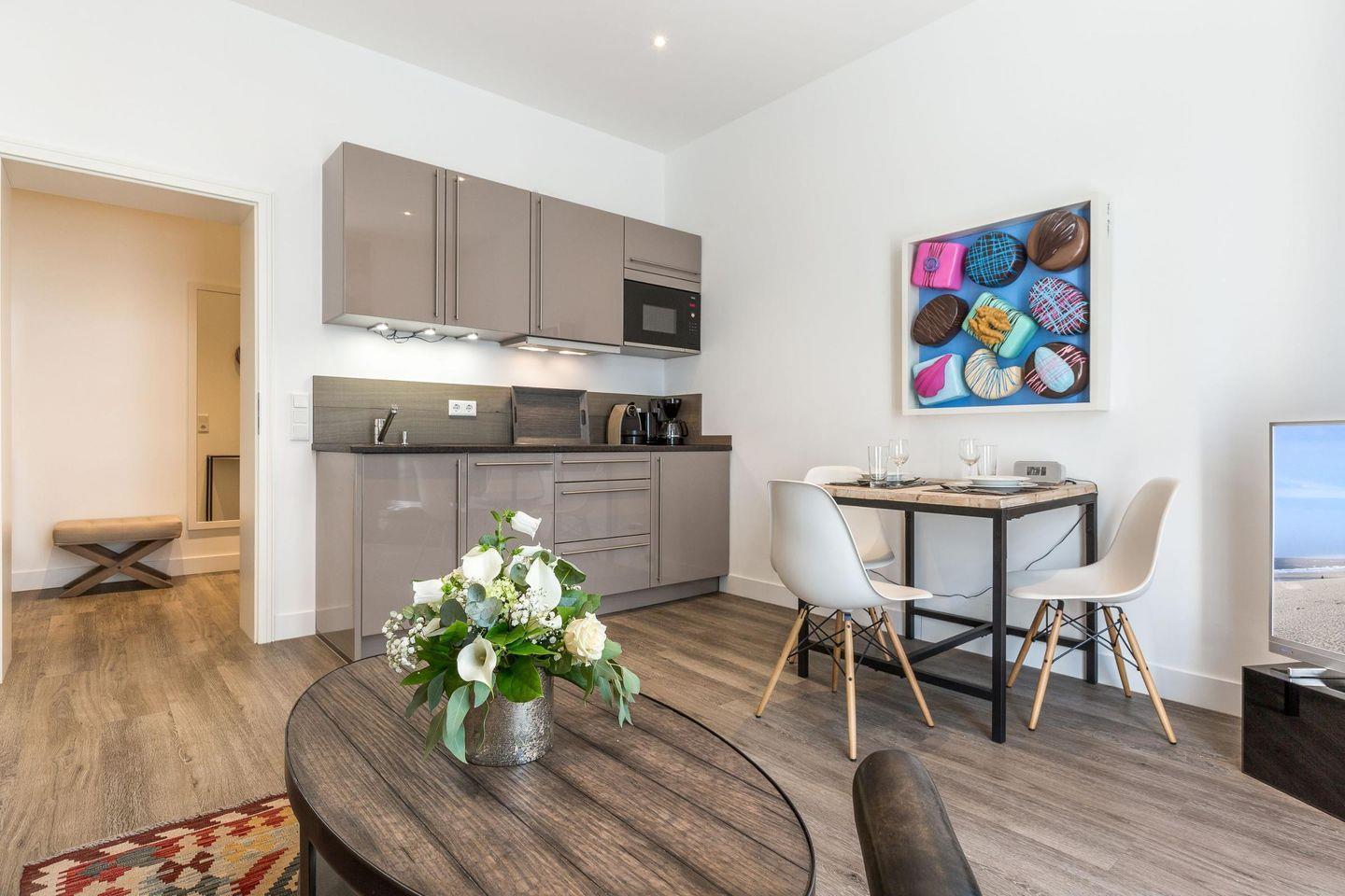 Die exklusive 2-Zimmer-Ferienwohnung 'Tom' mit ca. 41 m² auf 1 Ebene (2. OG, Fahrstuhl vorhanden) bietet Platz für bis zu 2 Personen und liegt zentral und nur 150 Meter vom Strand entfernt. Die Wohnung befindet sich im neu gestalteten Gebäude des traditionsreichen Hotels 'Seeburg' an der Kurpromenade von Westerland, das in Zusammenarbeit mit der Kunstgalerie Mensing renoviert wurde. Jede Wohnung in diesem Projekt ist einem Künstler gewidmet und bietet ein einzigartiges Retro-Design, ergänzt durch hochwertiges Mobiliar aus Frankreich, Belgien und England. Haustiere sind nicht gestattet, Nichtraucherwohnung.