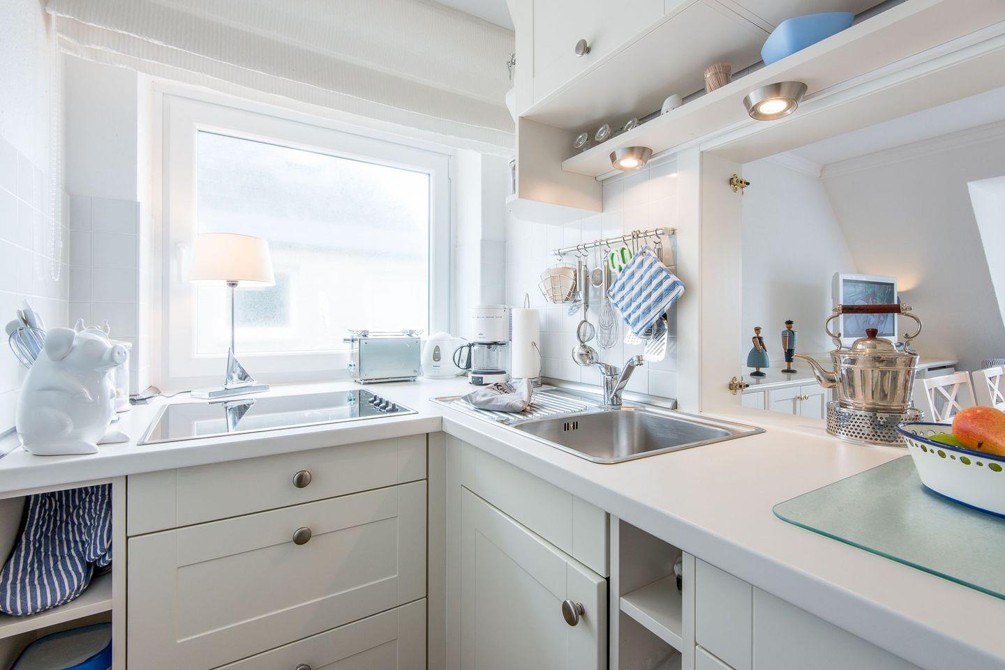 Die separate Küche ist funktional und modern ausgestattet. Hier finden Sie alle notwendigen Geräte, darunter ein Cerankochfeld, einen Backofen und eine Filterkaffeemaschine – ideal für die Zubereitung köstlicher Mahlzeiten in Ihrer Ferienwohnung.