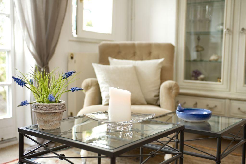 Das helle Wohnzimmer ist mit einem bequemen Polstersofa für 2 Personen, zwei Sesseln, einem TV und einem Esstisch mit 4 Stühlen ausgestattet. Der direkte Zugang zur möblierten Süd-West-Terrasse macht diesen Bereich zu einem perfekten Ort, um die frische Meeresluft zu genießen.