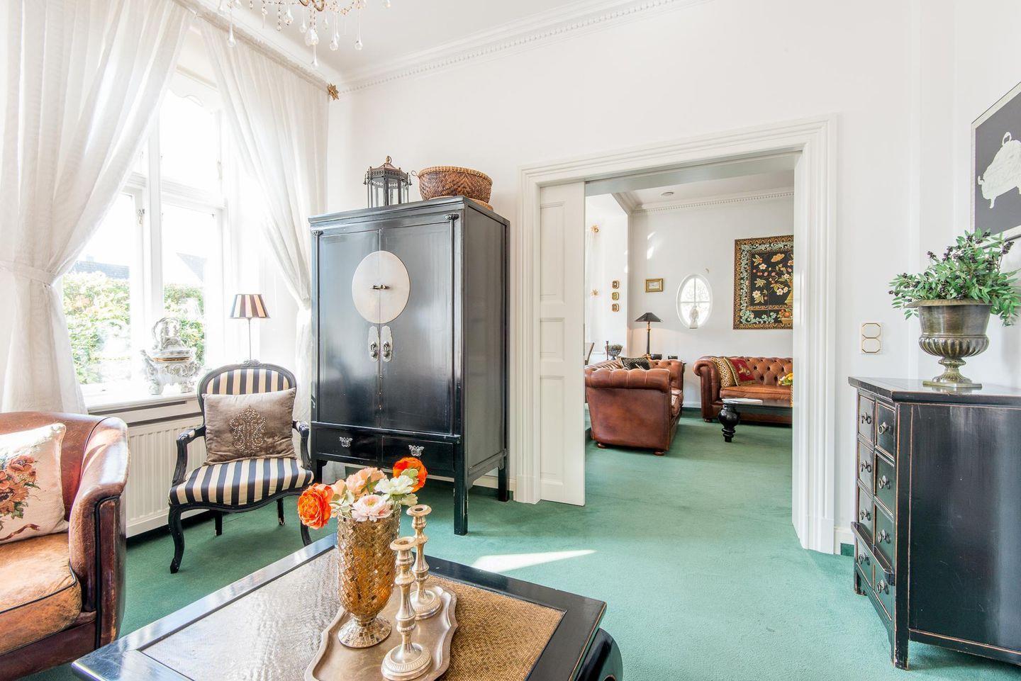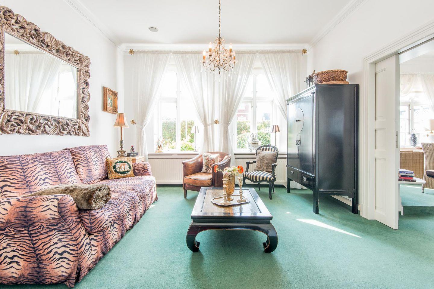 Das elegante Wohnzimmer lädt mit seinem Wintergarten und dem gemütlichen Kamin zu entspannten Stunden ein. Für Unterhaltung sorgen ein moderner TV und eine hochwertige B&O Stereoanlage. Hier können Sie sich nach einem Tag voller Erlebnisse zurückziehen, die Füße hochlegen und den Abend bei knisterndem Kaminfeuer ausklingen lassen. Der Wintergarten sorgt zudem für viel Licht und bietet einen herrlichen Blick ins Grüne.