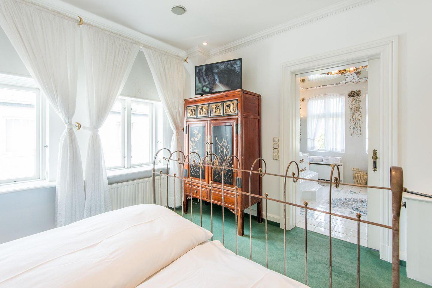 Die drei geräumigen Schlafzimmer bieten höchsten Schlafkomfort. Zwei der Schlafzimmer sind mit bequemen Doppelbetten (160x200 cm) und TV ausgestattet. Eines dieser Schlafzimmer verfügt über einen direkten Zugang zu einem luxuriösen Badezimmer mit Whirlwanne und Duschkabine – einzigartig gestaltet mit edlen Fliesen und Glasarbeiten von Barbara Flügel aus Meissen. Das dritte Schlafzimmer bietet zwei Einzelbetten (90x200 cm), ideal für Kinder oder weitere Gäste.