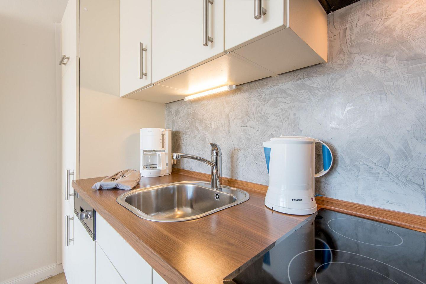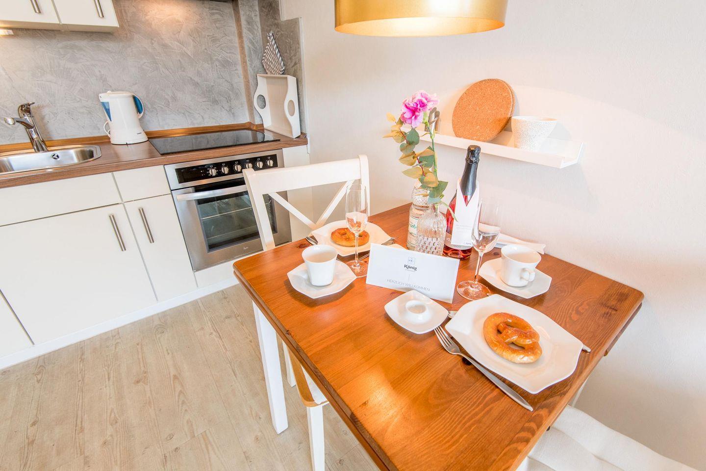 Die offene Küche ist modern ausgestattet und verfügt über ein 4-Platten-Cerankochfeld sowie alle notwendigen Utensilien, um sich kulinarisch zu entfalten. Ob Sie ein ausgiebiges Frühstück oder ein Abendessen zaubern möchten – hier finden Sie alles, was Sie brauchen.