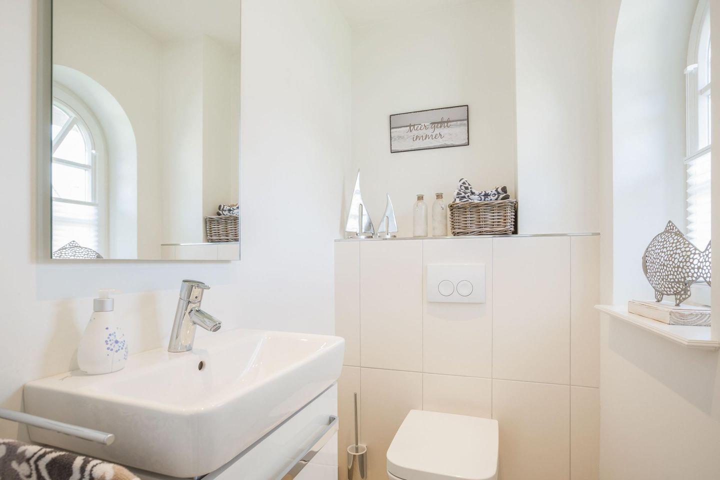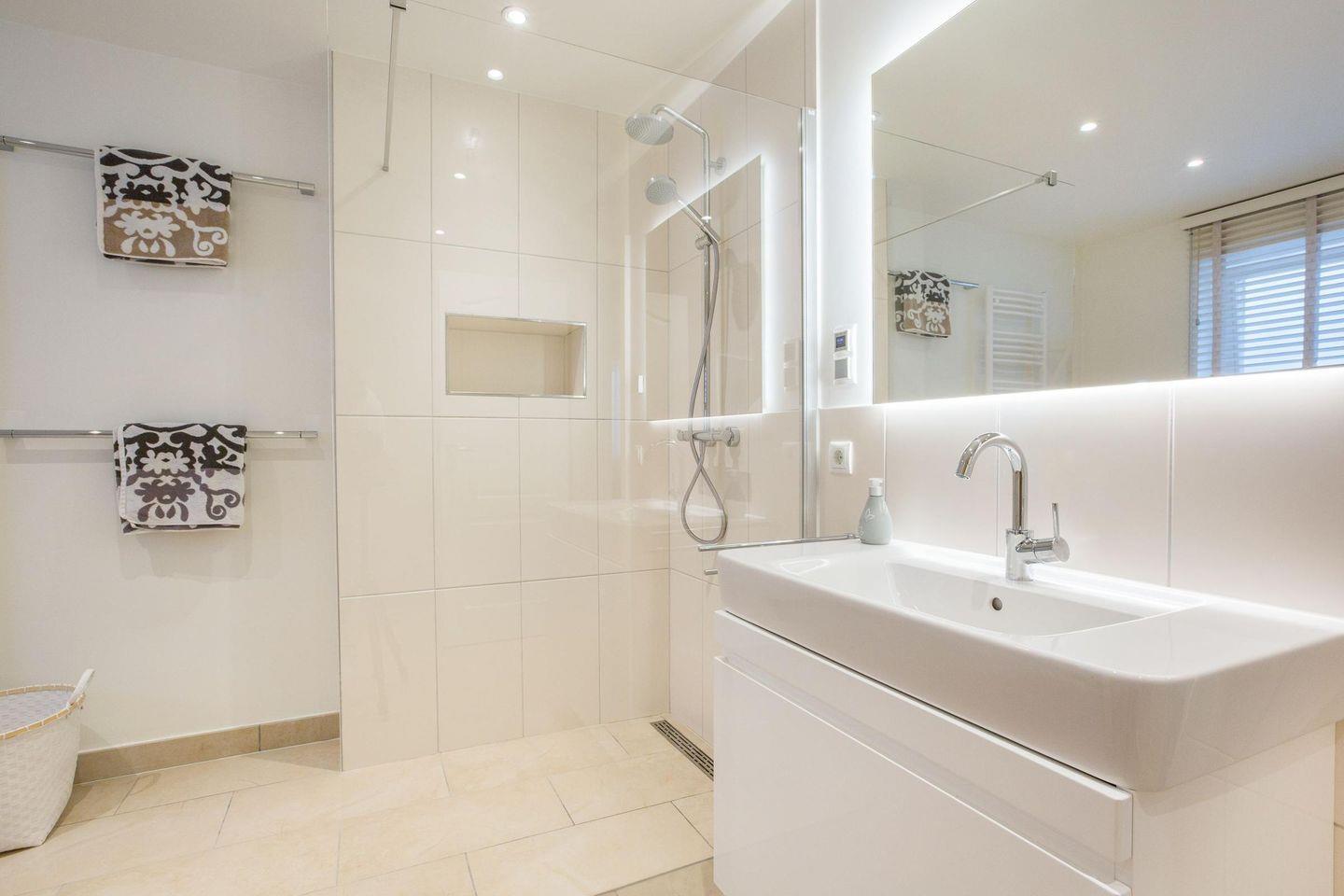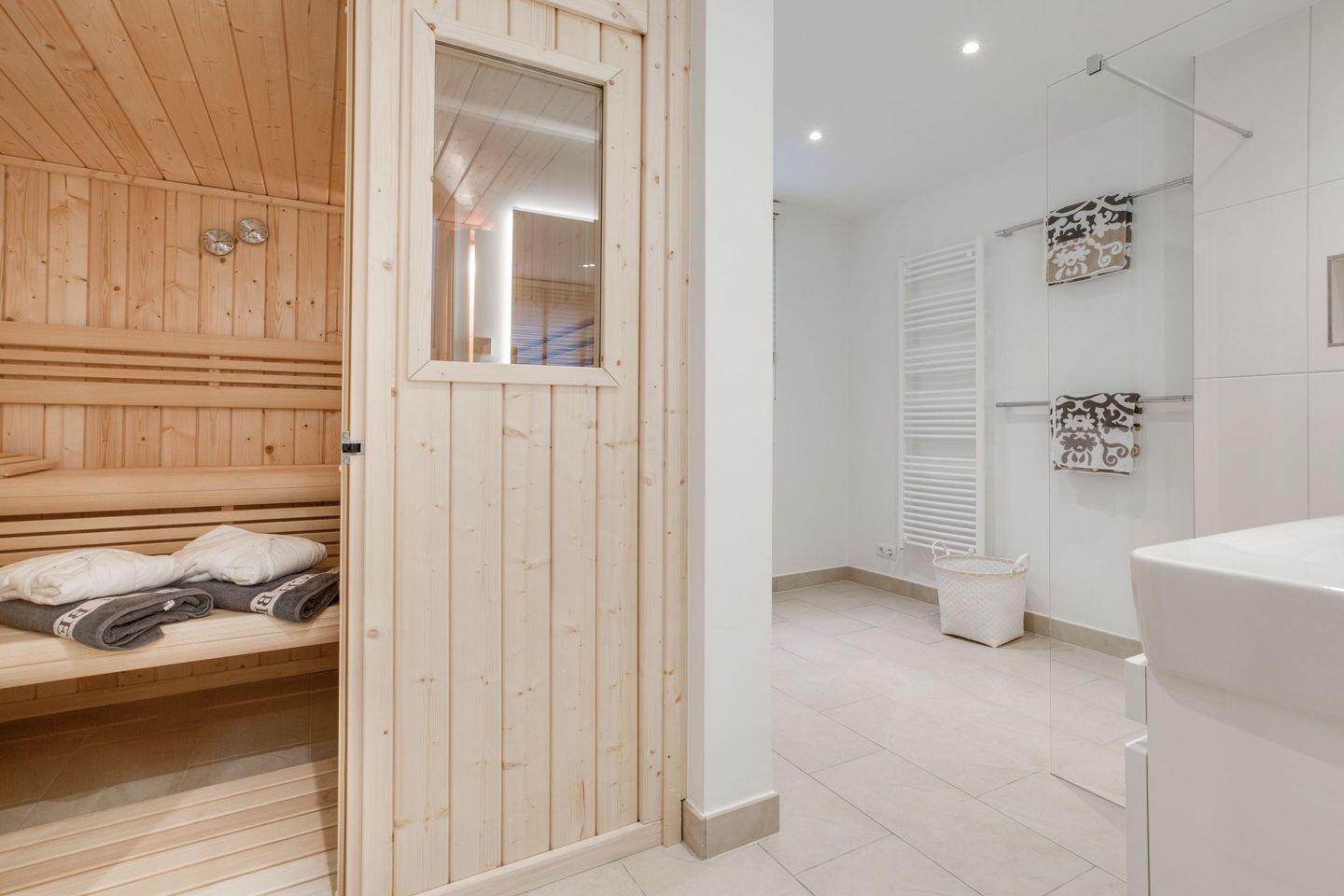 Zwei hochwertige Badezimmer und ein separates Gäste-WC, die allen Komfort für einen angenehmen Aufenthalt bieten. Das erste Badezimmer besticht mit einer ebenerdigen Dusche, einem WC und einem Handtuchwärmer und wird durch das Tageslicht angenehm erhellt, was für eine einladende Atmosphäre sorgt. Das zweite, großzügig gestaltete Badezimmer bietet ebenfalls eine bodengleiche Dusche, ein WC und einen Handtuchwärmer, und ist zusätzlich mit einer luxuriösen Sauna ausgestattet – perfekt für entspannende Momente und eine wohlverdiente Erholung vom Alltag. Das separate Gäste-WC im Eingangsbereich sorgt für zusätzlichen Komfort und Flexibilität für Sie und Ihre Gäste.