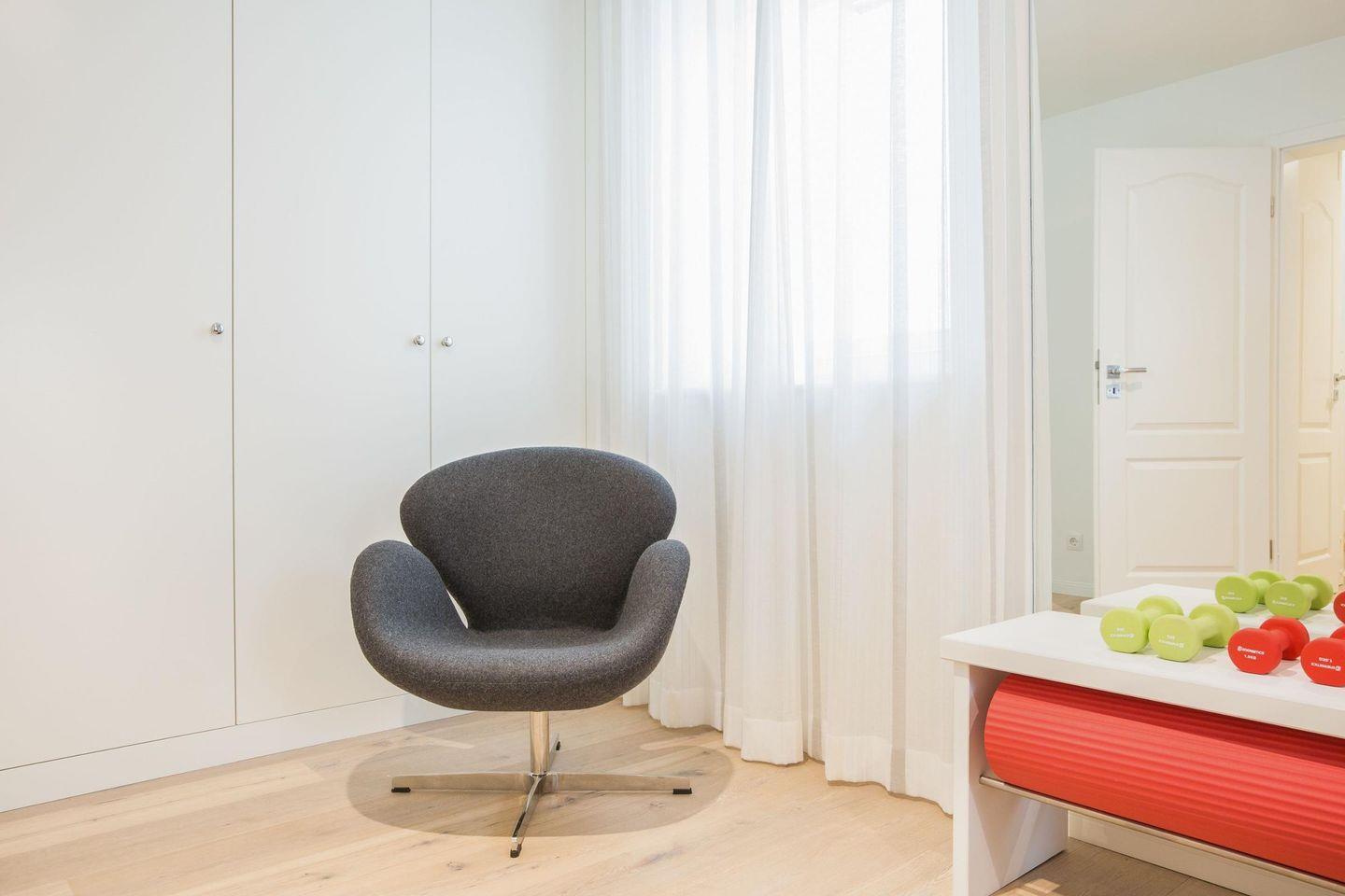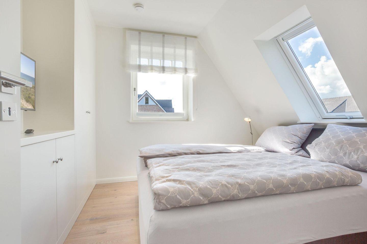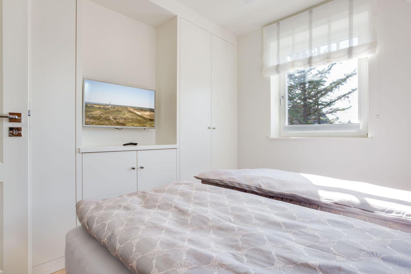 Das Haus bietet vier stilvoll eingerichtete Schlafzimmer, die jedem Gast eine komfortable und entspannte Nachtruhe ermöglichen. Das Hauptschlafzimmer verfügt über ein gemütliches Doppelbett (2x 80x200 cm) mit einem großen Einbauschrank für Ihre Garderobe und ist zusätzlich mit einem TV ausgestattet. Im zweiten Schlafzimmer finden Sie ebenfalls ein Doppelbett (2x 90x200 cm), einen Sessel sowie einen Safe im geräumigen Einbauschrank. Ein besonderer Pluspunkt ist der direkte Zugang zum privaten Südbalkon, ideal für ruhige Morgenstunden. Das dritte Schlafzimmer ist mit zwei bequemen Einzelbetten (je 90x200 cm) ausgestattet und bietet den perfekten Rückzugsort für Kinder oder Gäste. Im vierten Schlafzimmer wartet ein weiteres Doppelbett (2x 90x200 cm), ebenfalls mit einem TV, Sessel und einem Safe im Einbauschrank, auf Sie.